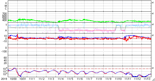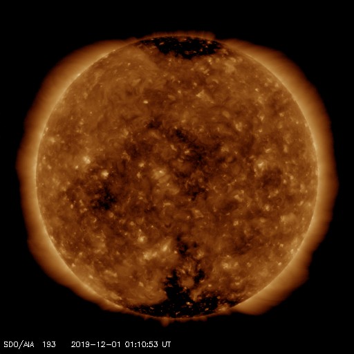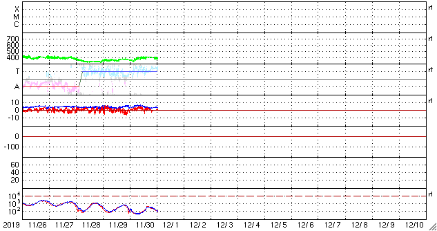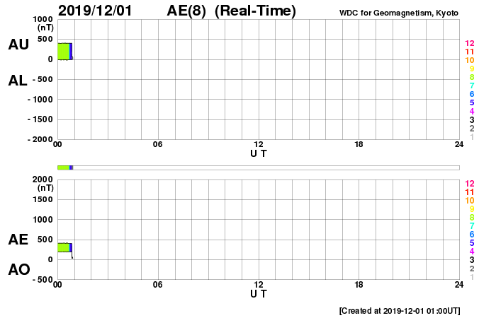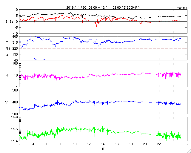 2019/12/ 1 10:16 更新 太陽風は平均的な速度になっています。磁気圏は静穏です。 担当 篠原 太陽風の速度は、昨日の午後に350km/秒から400km/秒へ上がり、 平均的な速さになっています。 掲載のグラフの最後では、速度は380km/秒へ下がりかけていて、 この後、低速風に戻るでしょうか。 あるいは、前周期の太陽風の様に、 このまま400km/秒前後で推移するかもしれません。 磁場強度は、4〜6nTと平均的な状態で推移しています。 南北成分は弱い北寄りになっていて、磁気圏は穏やかです。 AE指数はほとんど変化のない状態です。 太陽は無黒点が続いています。 X線グラフも変化はありません。 ![]() SDO衛星のAIA193カメラによる太陽コロナの様子 (c) SDO (NASA) ![]() SDO衛星による太陽の可視光写真 (c) SDO (NASA) ![]() DSCOVRが観測した太陽風の磁場(1番上の枠、黒線は全体の強度、赤線は南北成分) および、太陽風の密度(3番目の紫線)、速度(4番目の青線) (c) データ:NOAA/SWPC、作図:宇宙天気ニュース ![]() AE指数(速報値) 下段のAEグラフの値が高くなると、オーロラ活動が活発化しています。 (c) 京都大学WDC ![]() ![]() 27日の太陽周期に合わせたデータプロット 太陽が同じ面を地球に向けていた27日前の変化から、今後を予想することができます。 (c) 作図:宇宙天気ニュース