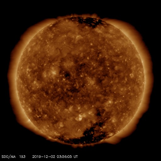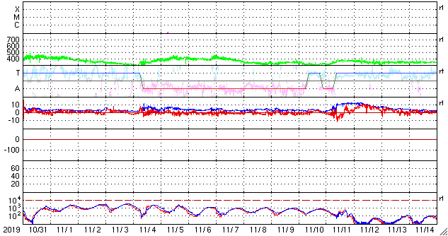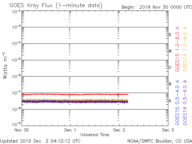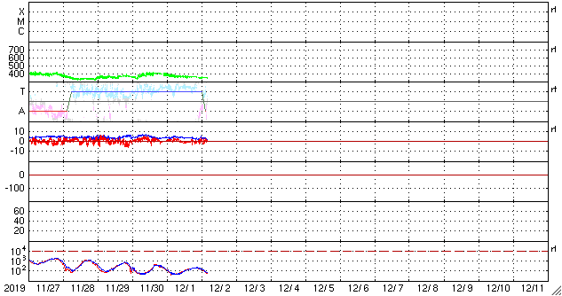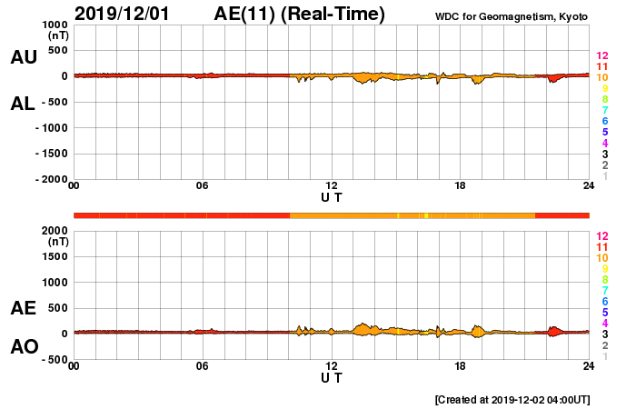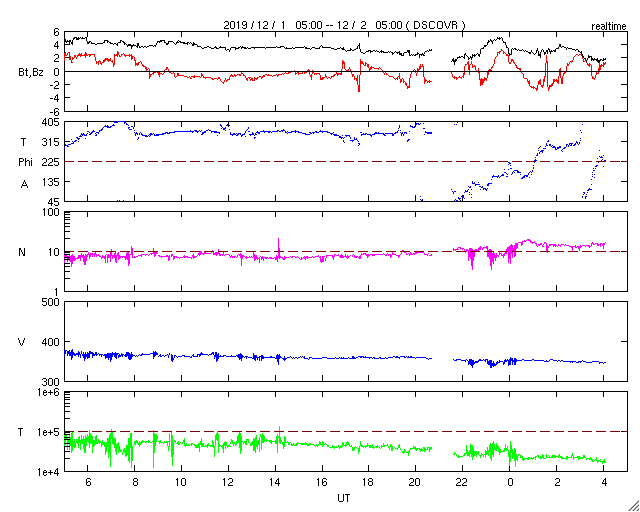 2019/12/ 2 13:12 更新 太陽風は低速になっています。11月の黒点数は 0.5 でした。 担当 篠原 WDC-SILSOより、 11月の黒点相対数の月平均値は、 0.5 と発表されました。 先月に続いて月平均値が 1.0 を割っています。 今回の極小期としては5回目 (2019年2月、7月、8月、10月、11月) です。 この回数については、 前回の極小期の4回 (2008〜2009年にかけて) を上回りました。 これにより、13か月平均値(図の赤線)は、 5月時点で 3.9 に下がっています。 数字そのものを比較してもあまり意味がないと思いますが、 前の極小期に 4.0 を割ったのは、2008年8月で 3.8 でした その4か月後の2008年12月に 2.2 まで下がって極小を迎えています。 今回はこの後どこまで下がっていくのでしょうか。 また、11月に黒点相対数が 0 でなかったのは、 1日、2日、4日、13日の4日だけでした。 無黒点の日は 26日となり、 25日以上の月は6月から6か月連続になりました。 現在の極小期としては 9回目で、 こちらの記録も前回の極小期に並びました。 周期の切り替わりがどこでやって来るのか、 今後の黒点が増え始める瞬間に注目してください。 太陽は今日も無黒点です。 X線グラフも変化はありません。 太陽風は、速度が350km/秒へ下がり、 低速の状態になっています。 磁場強度も2〜4nTとやや弱くなっています。 27日周期の図を見ると、前周期の太陽風は、 この辺りから400km/秒程度に高まっていたのですが、 今回はどうでしょうか。 磁気圏は静穏で、AE指数は小さい変化が見られる程度です。