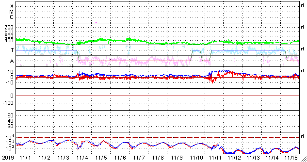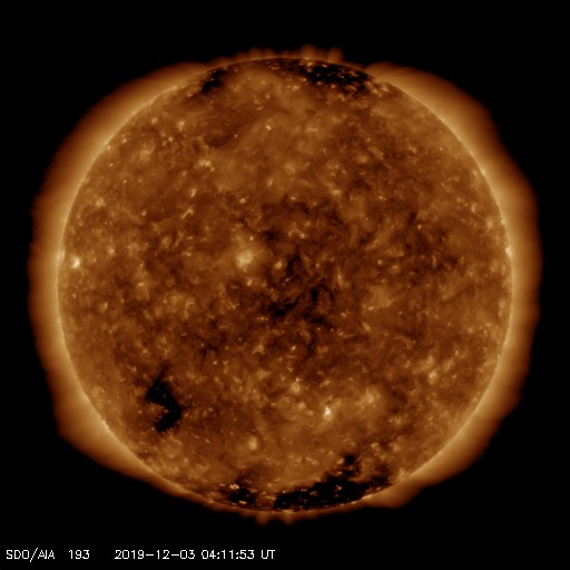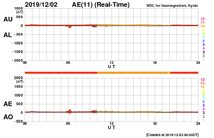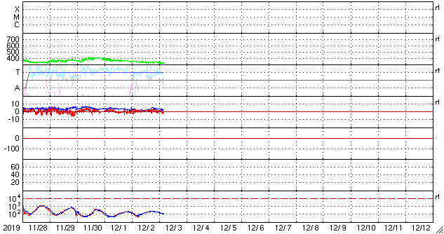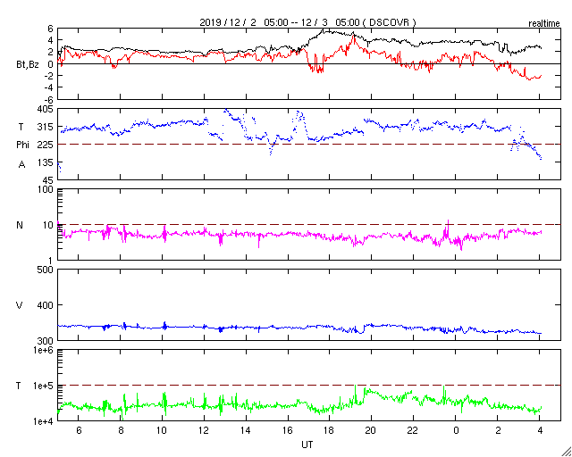2019/12/ 3 13:16 更新 低速の穏やかな太陽風が続いています。 担当 篠原 太陽風の速度は、350km/秒から320km/秒へ下がり、 更に低速になっています。 磁場強度は、3〜4nTとやや弱い状態で推移しています。 磁場の南北成分は北寄りになっていて、 速度が遅くなっていることもあり、磁気圏はとても穏やかです。 AE指数はほとんど変化が見られません。 27日周期の図を見ると、 前周期の太陽風は、 掲載のグラフの範囲では、ずっと穏やかな状態が続いています。 この後の11月17日に小さい速度の高まりが来ているのですが、 今回も回帰するでしょうか。 また、本格的な速度の高まりは11月21日に到来しています。 これは、グラフの終わりから5日後のことです。 太陽も、無黒点で穏やかな状態が続いています。