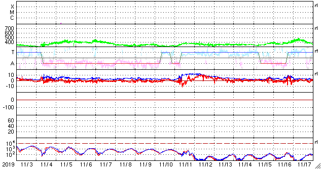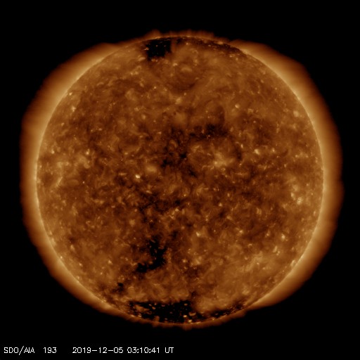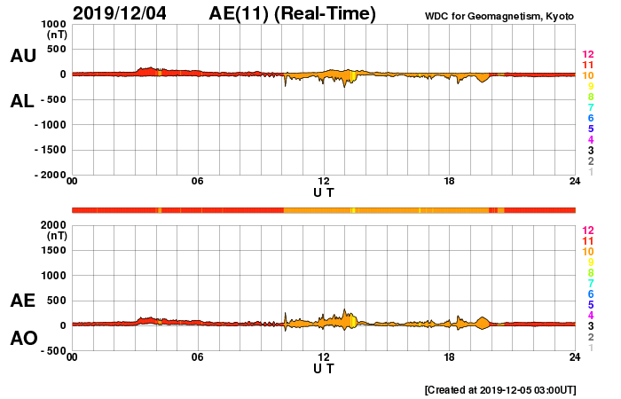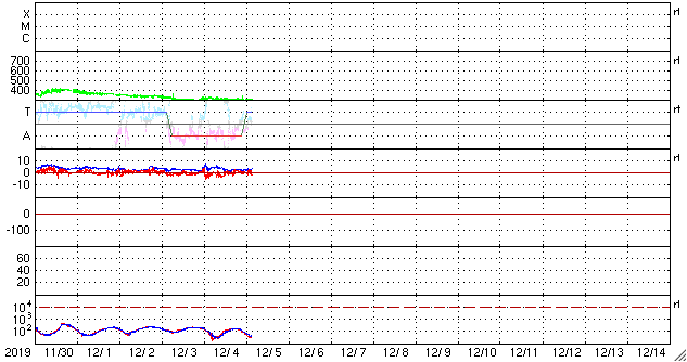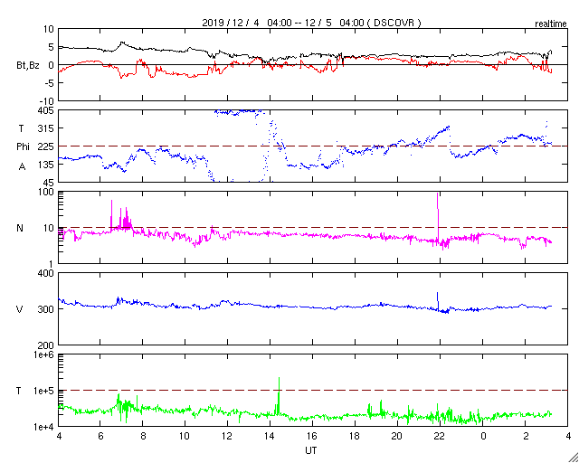 2019/12/ 5 12:25 更新 太陽風は300km/秒と低速で、磁気圏も穏やかです。 担当 篠原 太陽風は、300km/秒と低速の状態で推移しています。 磁場強度も、2〜3nTと弱くなっています。 磁場の南北成分は、 グラフの前半に弱い南向きが見られる程度で、 以降は0nT付近で小さい変化になっています。 低速ということもあり、磁気圏は穏やかです。 27日周期の図を見ると、 前周期の太陽風はこの後も低速の風が続いています。 一方、SDO衛星AIA193では、太陽の中心部から南に向かって、 ぼんやりとコロナホールが見えている様です。 今回はこの領域の影響が多少見られるかもしれません。 4日後くらいの太陽風の変化に注目してください。 太陽は無黒点です。 X線グラフも全く変化がありません。 ![]() SDO衛星のAIA193カメラによる太陽コロナの様子 (c) SDO (NASA) ![]() SDO衛星による太陽の可視光写真 (c) SDO (NASA) ![]() DSCOVRが観測した太陽風の磁場(1番上の枠、黒線は全体の強度、赤線は南北成分) および、太陽風の密度(3番目の紫線)、速度(4番目の青線) (c) データ:NOAA/SWPC、作図:宇宙天気ニュース ![]() AE指数(速報値) 下段のAEグラフの値が高くなると、オーロラ活動が活発化しています。 (c) 京都大学WDC ![]() ![]() 27日の太陽周期に合わせたデータプロット 太陽が同じ面を地球に向けていた27日前の変化から、今後を予想することができます。 (c) 作図:宇宙天気ニュース