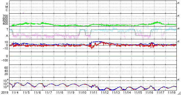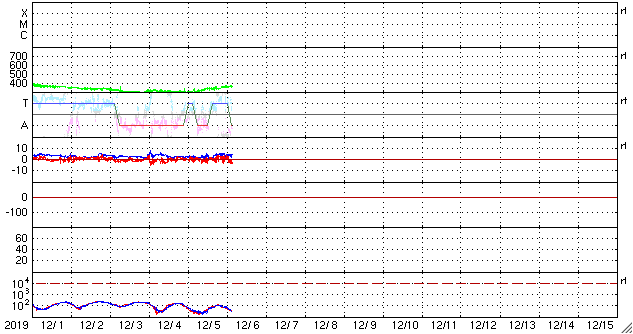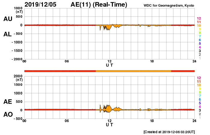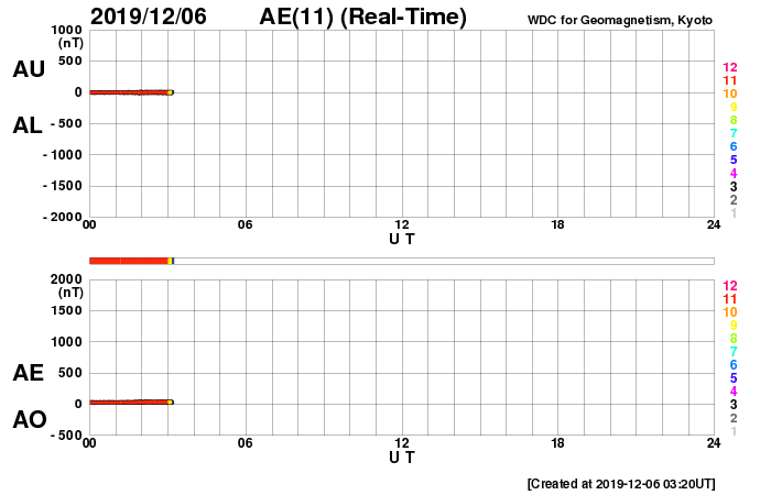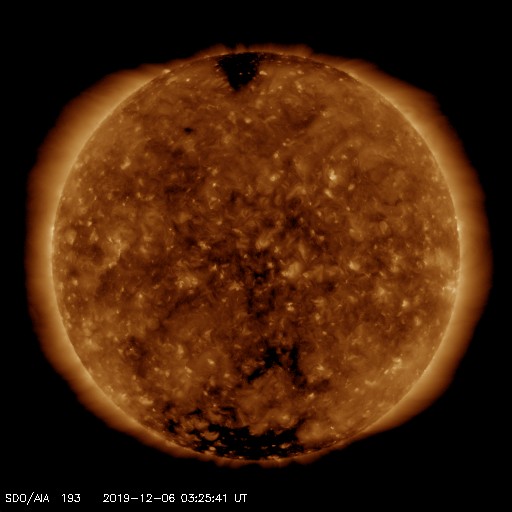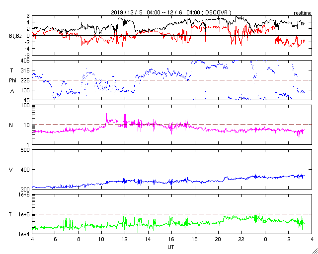 2019/12/ 6 12:31 更新 太陽に小さい黒点が現れています。太陽風は低速です。 担当 篠原 今朝くらいから、太陽の北西(右上)に小さい黒点が現れています。 緯度は24°くらいと高めなのですが、 磁場の並びは、現在の第24活動周期の順番の様です。 この後、より大きくなるでしょうか。 今のところ、X線グラフに変化はなく、 太陽は穏やかです。 太陽風の速度は、昨日の午後からゆっくりと上昇しています。 低速の状態は続いていますが、 昨日の300km/秒から、現在は370km/秒へ変化しています。 磁場強度は、2〜5nTの間を上下していて、 全体としてはやや弱い状態です。 現在の様子だと、速度の高まりは小さい変化で終わりそうです。 磁気圏は、全体としては穏やかで、 AE指数は、小規模の変化が1回起きている程度です。 SDO衛星AIA193では、 太陽の中央部の南側に淡いコロナホールが見えています。 今後、この領域の影響が見られるでしょうか。 ![]() SDO衛星のAIA193カメラによる太陽コロナの様子 (c) SDO (NASA) ![]() SDO衛星による太陽の可視光写真。マウスの矢印を写真に重ねると、黒点番号付きの写真に切り替わります。 (c) SDO (NASA) ![]() GOES衛星の太陽X線データ (c) NOAA/SWPC ![]() DSCOVRが観測した太陽風の磁場(1番上の枠、黒線は全体の強度、赤線は南北成分) および、太陽風の密度(3番目の紫線)、速度(4番目の青線) (c) データ:NOAA/SWPC、作図:宇宙天気ニュース ![]() AE指数(速報値) 下段のAEグラフの値が高くなると、オーロラ活動が活発化しています。 (c) 京都大学WDC ![]() ![]() 27日の太陽周期に合わせたデータプロット 太陽が同じ面を地球に向けていた27日前の変化から、今後を予想することができます。 (c) 作図:宇宙天気ニュース