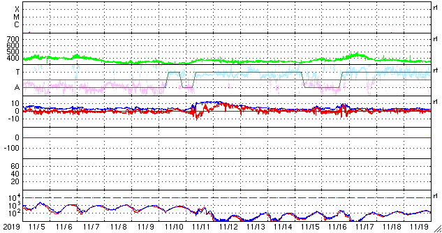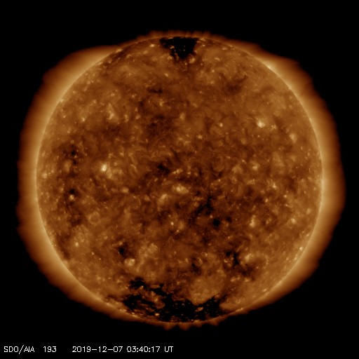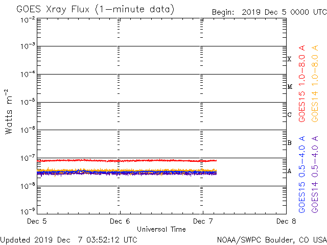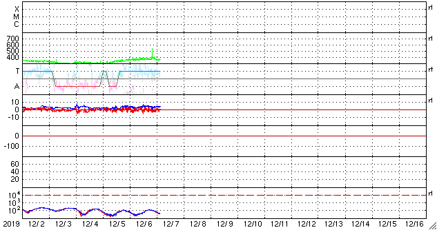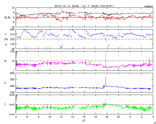 2019/12/ 7 12:54 更新 太陽は無黒点に戻っています。低速の太陽風が続いています。 担当 篠原 昨日、太陽の北西部(右上)に見えていた小さい黒点は、 夜には見えなくなり、太陽は無黒点に戻っています。 X線グラフも変化はありません。 太陽風は、360〜370km/秒と低速の風が続いています。 磁場強度は、4nTと平均的な状態です。 磁場の南北成分は、0nT付近で小さく変化する程度で、 磁気圏は穏やかです。 SDO衛星AIA193の太陽コロナ写真では、 目立つほどのコロナホールは見られず、 太陽風は穏やかな状態がしばらく続きそうです。 掲載している27日周期の図では、 前周期の太陽風はずっと穏やかな状態で、 次の高まりは、図の後の11月21日に始まっています。