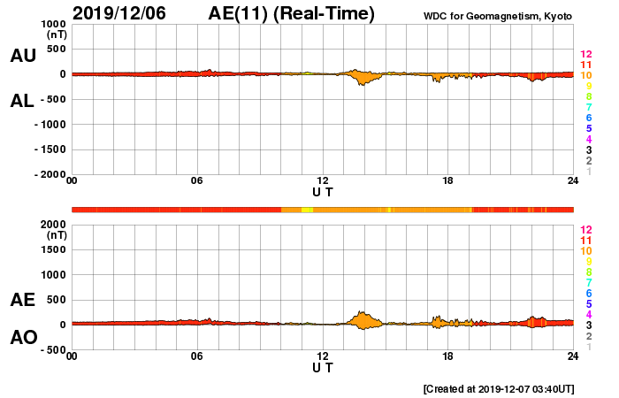 (c) SDO (NASA) ![]() SDO衛星による太陽の可視光写真 (c) SDO (NASA) ![]() GOES衛星の太陽X線データ (c) NOAA/SWPC ![]() DSCOVRが観測した太陽風の磁場(1番上の枠、黒線は全体の強度、赤線は南北成分) および、太陽風の密度(3番目の紫線)、速度(4番目の青線) (c) データ:NOAA/SWPC、作図:宇宙天気ニュース ![]() AE指数(速報値) 下段のAEグラフの値が高くなると、オーロラ活動が活発化しています。 (c) 京都大学WDC ![]() ![]() 27日の太陽周期に合わせたデータプロット 太陽が同じ面を地球に向けていた27日前の変化から、今後を予想することができます。 (c) 作図:宇宙天気ニュース