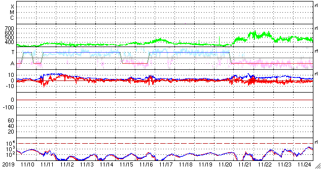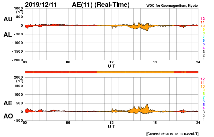 (c) SDO (NASA) ![]() SDO衛星による太陽の可視光写真 (c) SDO (NASA) ![]() DSCOVRが観測した太陽風の磁場(1番上の枠、黒線は全体の強度、赤線は南北成分) および、太陽風の密度(3番目の紫線)、速度(4番目の青線) (c) データ:NOAA/SWPC、作図:宇宙天気ニュース ![]() AE指数(速報値) 下段のAEグラフの値が高くなると、オーロラ活動が活発化しています。 (c) 京都大学WDC ![]() ![]() 27日の太陽周期に合わせたデータプロット 太陽が同じ面を地球に向けていた27日前の変化から、今後を予想することができます。 (c) 作図:宇宙天気ニュース