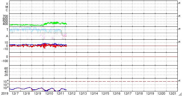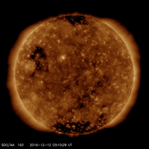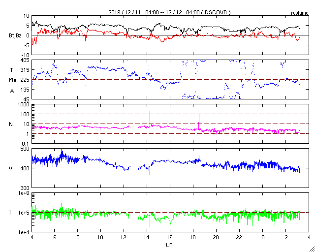 2019/12/12 12:24 更新 太陽風は400km/秒と平均的な速度です。 担当 篠原 太陽風の速度は、 440km/秒から400km/秒へゆっくりと下がっています。 27日周期の図を見ると、 2日程の速度の弱い高まりになっています。 この後は、低速の風になっていくでしょうか。 太陽風の磁場強度は、 2〜4nTで変化していて、やや弱くなっています。 南北成分の変化も、小幅に留まっています。 磁気圏は穏やかで、 AE指数は小規模の変化が1回起きている程度です。 SDO衛星AIA193では、 北東部(左上)のコロナホールが見やすくなってきました。 前周期とあまり変化がない様に見えますが、どうでしょうか。 明日になるとより比べやすくなるでしょう。 太陽は無黒点です。 X線グラフも静かです。