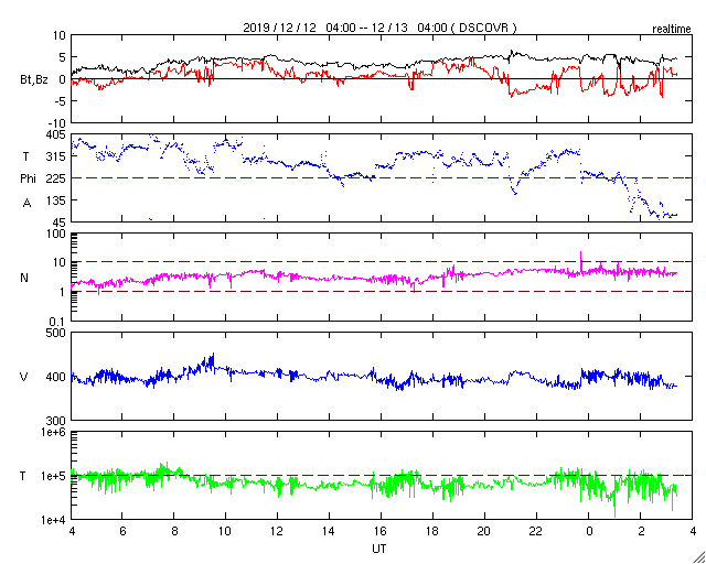 - 2019/12/ 8 13:19 低速の太陽風が続いています。磁気圏も穏やかです。