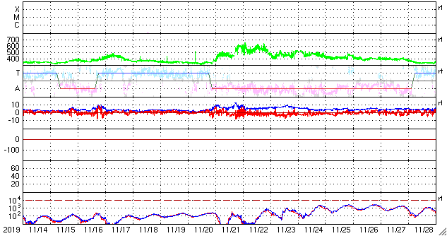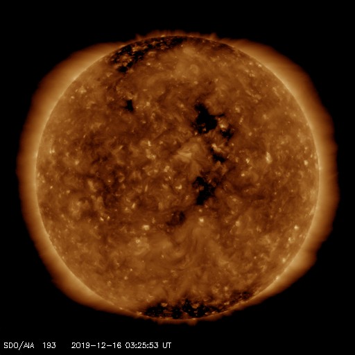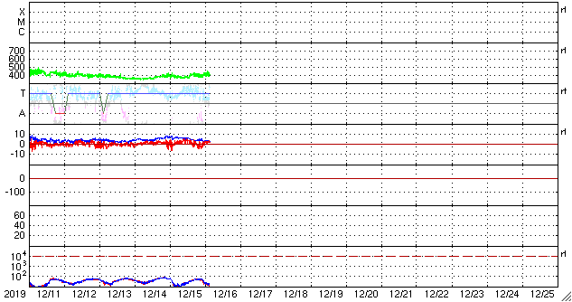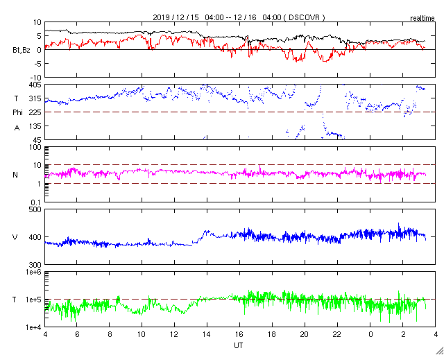 2019/12/16 12:31 更新 太陽風は平均的な速度です。磁気圏は穏やかです。 担当 篠原 太陽風の速度は、 昨夜にかけて370km/秒とやや低速になりましたが、 今日に入る頃から400km/秒と平均的な状態に戻っています。 磁場強度は、7nTから3nTへゆっくり下がっています。 現在はやや弱い状態です。 磁場の南北成分は北寄りの傾向が続いていて、 磁気圏は穏やかです。 一時的に磁場が南向きに変化して、 AE指数に300nTの小規模の変化が起きています。 SDO衛星AIA193では、 中央部のコロナホールが少し西に進んでいます。 2日後くらいから、 この領域の影響で太陽風の速度が高まりそうです。 太陽は、今日も無黒点です。 X線グラフも変化は見られません。 ![]() SDO衛星のAIA193カメラによる太陽コロナの様子 (c) SDO (NASA) ![]() SDO衛星による太陽の可視光写真 (c) SDO (NASA) ![]() DSCOVRが観測した太陽風の磁場(1番上の枠、黒線は全体の強度、赤線は南北成分) および、太陽風の密度(3番目の紫線)、速度(4番目の青線) (c) データ:NOAA/SWPC、作図:宇宙天気ニュース ![]() AE指数(速報値) 下段のAEグラフの値が高くなると、オーロラ活動が活発化しています。 (c) 京都大学WDC ![]() ![]() 27日の太陽周期に合わせたデータプロット 太陽が同じ面を地球に向けていた27日前の変化から、今後を予想することができます。 (c) 作図:宇宙天気ニュース