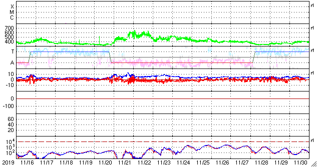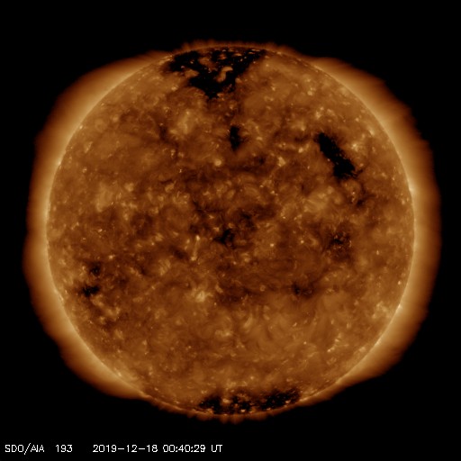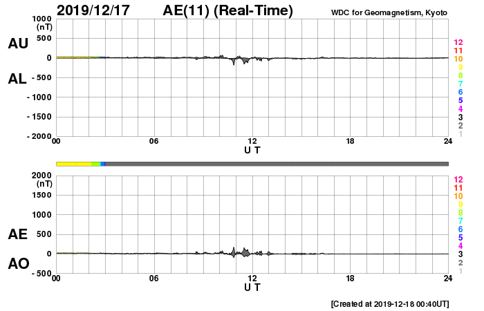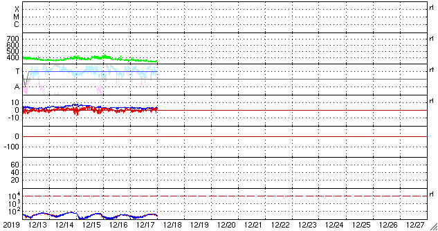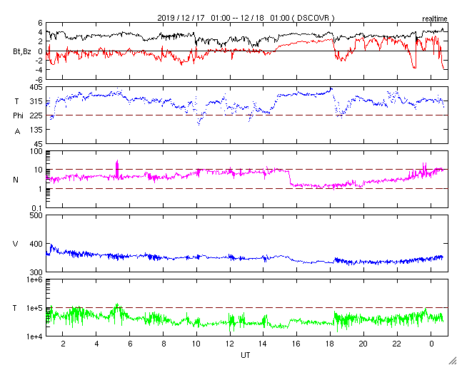 2019/12/18 09:58 更新 太陽風は低速です。これからコロナホールの影響が始まりそうです。 担当 篠原 太陽風は、350km/秒と低速の風が続いています。 磁場強度も、3〜4nTとやや弱い状態で安定しています。 SDO衛星AIA193では、 北西側(右上)にコロナホールが見えていて、 これからこの領域の影響が始まりそうです。 27日周期の図でも、前周期の太陽風の高まりが始まった頃です。 この後、磁場強度や速度に変化が始まりそうです。 前周期の太陽風は、600km/秒まで速度が高まり、 速度の高まりは4日ほど続きました。 今回はどの様な変化になるでしょうか。 現在の磁気圏は穏やかです。 AE指数はほとんど変化のない状態です。 太陽は無黒点が続いています。 X線グラフも静かです。