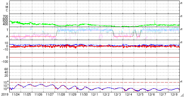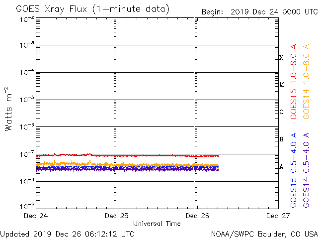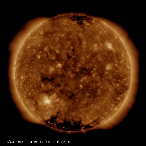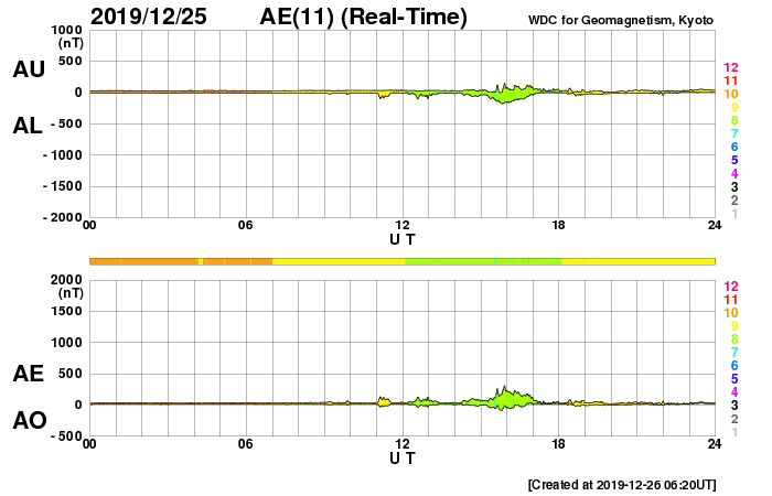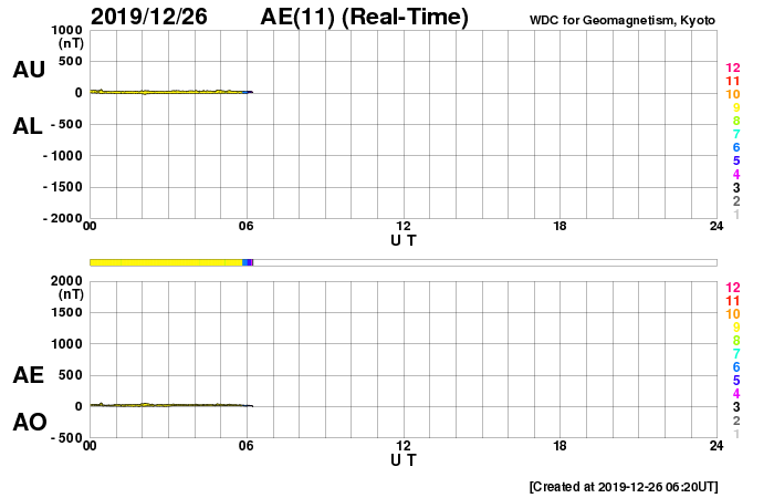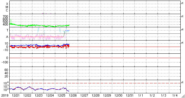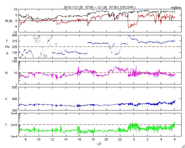 2019/12/26 15:20 更新 黒点は小さくなっています。太陽風は低速で、磁気圏も穏やかです。 担当 篠原 太陽の黒点は、どちらも小さくなっています。 特に北西の2754群は、掲載の写真ではほとんど見えません。 X線グラフも変化はなく、太陽は穏やかです。 太陽風は、350km/秒と低速の状態が続いています。 磁場強度は、一旦、1nTに下がり、 その後、8nTとやや強まった状態になっています。 27日周期の図を見ると、 セクターのグラフがAからTに変わっていて、、 太陽風磁場の大まかな方向が切り替わっています。 磁場強度の変化はこれに関係しているのでしょう。 磁場の南北成分は、全体的に北寄りになっています。 このため磁気圏は穏やかで、 AE指数は小規模の変化が一時的に起きている程度です。 ![]() SDO衛星のAIA193カメラによる太陽コロナの様子 (c) SDO (NASA) ![]() SDO衛星による太陽の可視光写真。マウスの矢印を写真に重ねると、黒点番号付きの写真に切り替わります。 (c) SDO (NASA) ![]() GOES衛星の太陽X線データ (c) NOAA/SWPC ![]() DSCOVRが観測した太陽風の磁場(1番上の枠、黒線は全体の強度、赤線は南北成分) および、太陽風の密度(3番目の紫線)、速度(4番目の青線) (c) データ:NOAA/SWPC、作図:宇宙天気ニュース ![]() AE指数(速報値) 下段のAEグラフの値が高くなると、オーロラ活動が活発化しています。 (c) 京都大学WDC ![]() ![]() 27日の太陽周期に合わせたデータプロット 太陽が同じ面を地球に向けていた27日前の変化から、今後を予想することができます。 (c) 作図:宇宙天気ニュース