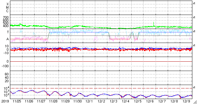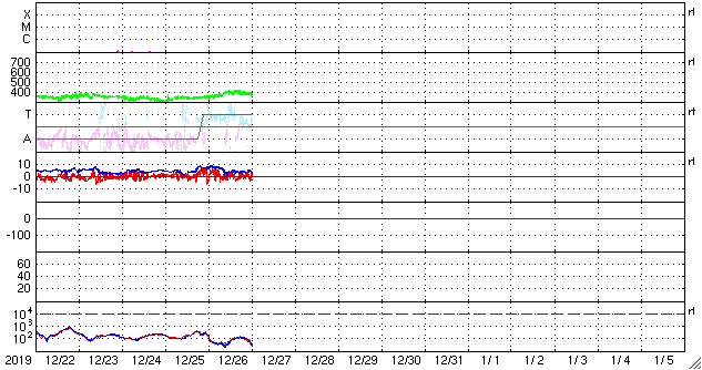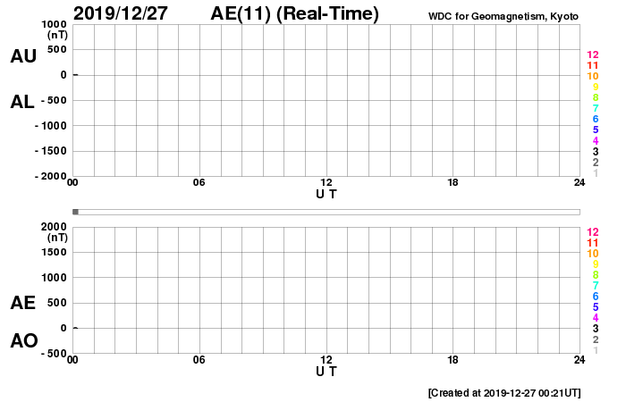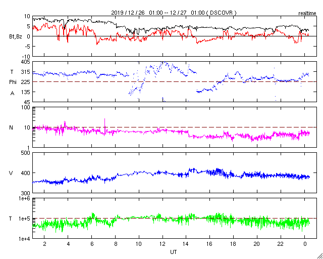 2019/12/27 09:39 更新 太陽は無黒点に戻っています。太陽風は平均的な状態です。 担当 篠原 太陽では、2754黒点群に続いて、 南半球の2753群も見えなくなっています。 太陽は無黒点に戻った様です。 新しい周期の黒点の発生は、次はいつになるでしょうか。 太陽風は、昨夜にかけて速度が350km/秒から400km/秒へ上がり、 平均的な速さに戻っています。 その後少し下がって、現在は380km/秒です。 磁場強度は、8nTから5nTへ少し下がり、 こちらも平均的な状態です。 磁場の南北成分は、小さく南北に変化する程度で、 磁気圏は穏やかです。 AE指数は、時々、小さい変化が起きる程度です。 SDO衛星AIA193の太陽コロナ写真は、 北極と南極にコロナホールの暗い広がりが見えていますが、 低緯度側は全体がぼんやりと光っているだけで、 コロナホールは見られません。 この後も、太陽風は穏やかな状態が続きそうです。