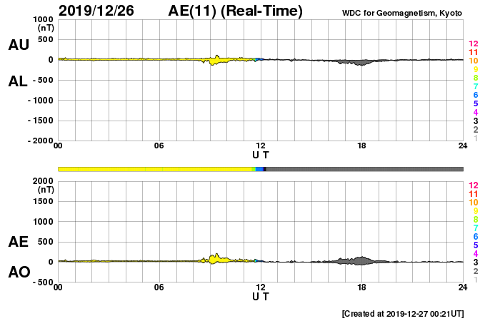 (c) SDO (NASA) ![]() SDO衛星による太陽の可視光写真 (c) SDO (NASA) ![]() GOES衛星の太陽X線データ (c) NOAA/SWPC ![]() DSCOVRが観測した太陽風の磁場(1番上の枠、黒線は全体の強度、赤線は南北成分) および、太陽風の密度(3番目の紫線)、速度(4番目の青線) (c) データ:NOAA/SWPC、作図:宇宙天気ニュース ![]() AE指数(速報値) 下段のAEグラフの値が高くなると、オーロラ活動が活発化しています。 (c) 京都大学WDC ![]() ![]() 27日の太陽周期に合わせたデータプロット 太陽が同じ面を地球に向けていた27日前の変化から、今後を予想することができます。 (c) 作図:宇宙天気ニュース