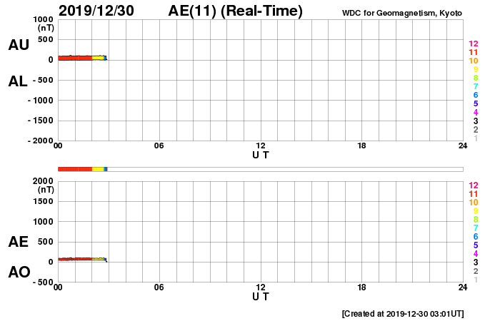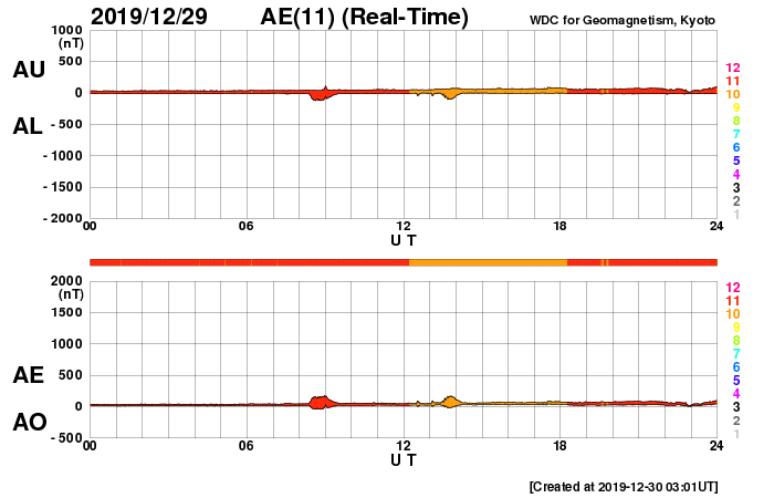 下段のAEグラフの値が高くなると、オーロラ活動が活発化しています。