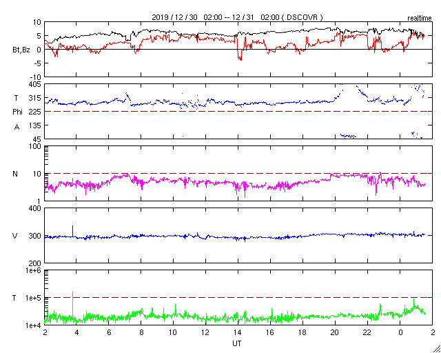 2019/12/30 12:06 太陽風はさらに低速になっています。磁気圏もとても穏やかです。