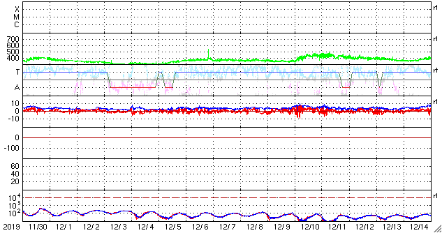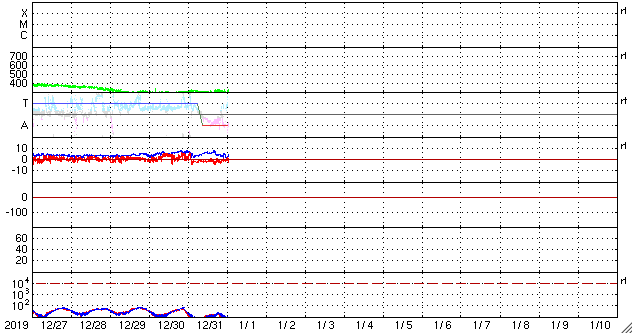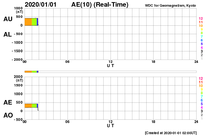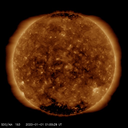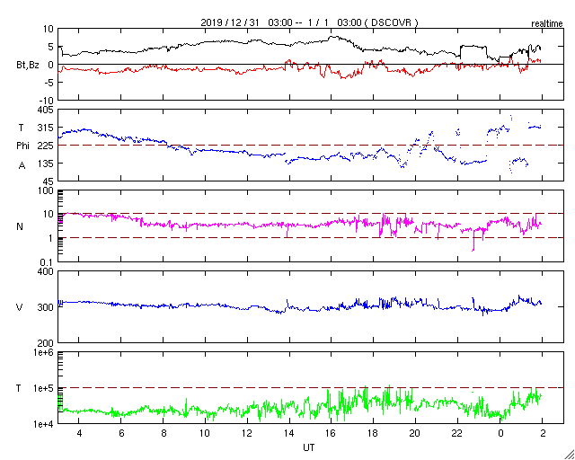 2020/ 1/ 1 11:09 更新 太陽にとても小さい黒点が現れています。太陽風は低速の風が続いています。 担当 篠原 明けましておめでとうございます。 宇宙天気は穏やかに新年を迎えています。 2020年も宇宙天気ニュースをよろしくお願い致します。 今年の注目は、太陽の第24期から第25期への活動周期の切り替わりでしょう。 このところ、新しい周期の黒点の出現が目立つ様になっています。 今日の太陽でも、南東の端に新しい周期の小さい黒点が現れた様です。 SDO衛星AIA193の太陽で、左下の端で明るく光っている場所です。 掲載の可視光写真では白斑しか見えませんが、 SDO衛星の可視光の拡大写真では、とても小さい黒い点が見えます。 緯度は南緯36度程度と高く、磁場の並びも新しい第25期の順番の様です。 また、AIA193の写真で、この黒点の領域の右上の光っている場所にも、 第25期の磁場の並びが発生しています。 緯度は南緯23度程度です。 新しい周期の領域の出現が続く様になっています。 引き続き、太陽の変化に注目して下さい。 太陽風は、300km/秒と低速の風が続いています。 磁場強度は、3〜5nTへ少し下がっています。 磁場の南北成分は、弱い南寄りになっていますが、 低速のため磁気圏の活動は穏やかで、 AE指数は、250nT程度の短時間の小さい変化が2回起きただけで、 その他は静かです。 SDO衛星AIA193では、 太陽の低緯度域のコロナは、全体がぼんやりと光っているだけです。 穏やかな太陽風がこの後も続きそうです。
