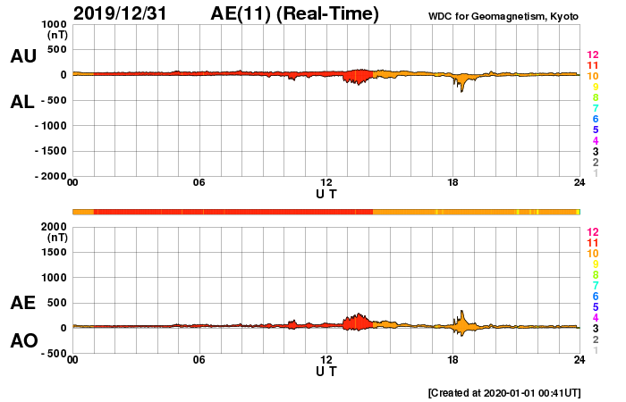(c) SDO (NASA) ![]() SDO衛星による太陽の可視光写真。マウスの矢印を写真に重ねると、黒点番号付きの写真に切り替わります。 (c) SDO (NASA) ![]() GOES衛星の太陽X線データ (c) NOAA/SWPC ![]() DSCOVRが観測した太陽風の磁場(1番上の枠、黒線は全体の強度、赤線は南北成分) および、太陽風の密度(3番目の紫線)、速度(4番目の青線) (c) データ:NOAA/SWPC、作図:宇宙天気ニュース ![]() AE指数(速報値) 下段のAEグラフの値が高くなると、オーロラ活動が活発化しています。 (c) 京都大学WDC ![]() ![]() 27日の太陽周期に合わせたデータプロット 太陽が同じ面を地球に向けていた27日前の変化から、今後を予想することができます。 (c) 作図:宇宙天気ニュース