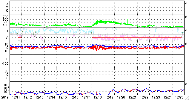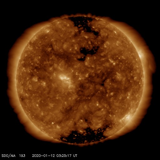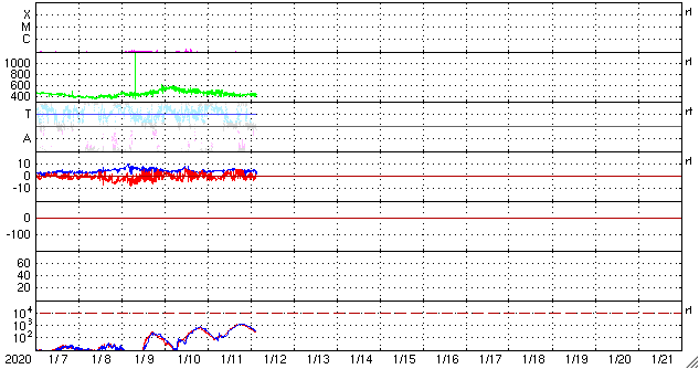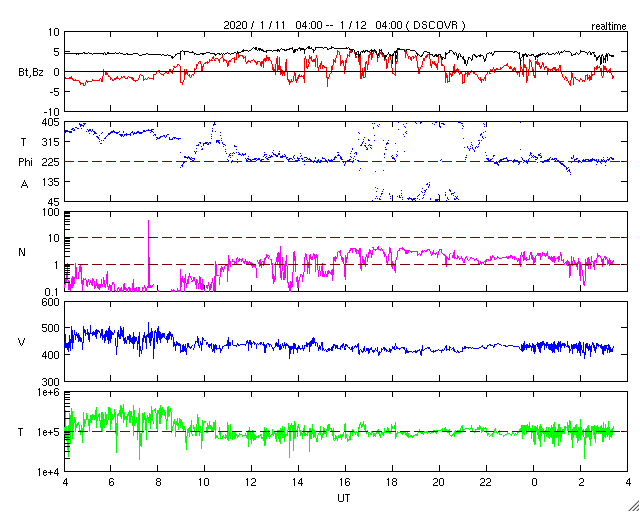 2020/ 1/12 12:38 更新 太陽風は平均的な状態です。太陽は無黒点になりました。 担当 篠原 昨日、460km/秒とやや高速だった太陽風の速度は、 夜になると430km/秒へ少し下がり、 現在までこの状態が続いています。 磁場強度は、4〜5nTで安定しています。 太陽風は平均的な状態です。 太陽風磁場の南北成分は、 グラフの中盤から北寄りになっていて、 時々、小さく南に向く程度です。 このため、磁気圏の変化も小さくなっていて、 AE指数は小規模の変化が2回起きている程度です。 SDO衛星AIA193では、 コロナホールの領域が西に進んでいます。 27日周期の図を参考にすると、 明後日くらいから太陽風の速度が高まりそうです。 オーロラの活動はどうなるでしょうか。 太陽は、2756黒点群が西の端に沈んで、 無黒点になっています。 X線グラフに変化はなく、太陽は穏やかです。