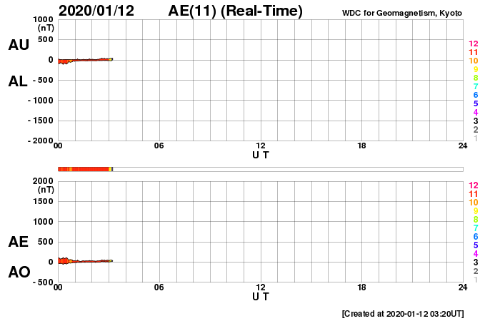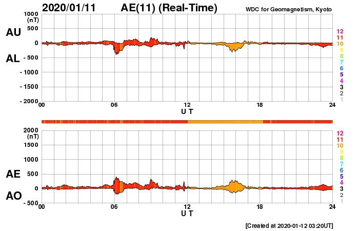 (c) SDO (NASA) ![]() SDO衛星による太陽の可視光写真 (c) SDO (NASA) ![]() DSCOVRが観測した太陽風の磁場(1番上の枠、黒線は全体の強度、赤線は南北成分) および、太陽風の密度(3番目の紫線)、速度(4番目の青線) (c) データ:NOAA/SWPC、作図:宇宙天気ニュース ![]() AE指数(速報値) 下段のAEグラフの値が高くなると、オーロラ活動が活発化しています。 (c) 京都大学WDC ![]() ![]() 27日の太陽周期に合わせたデータプロット 太陽が同じ面を地球に向けていた27日前の変化から、今後を予想することができます。 (c) 作図:宇宙天気ニュース