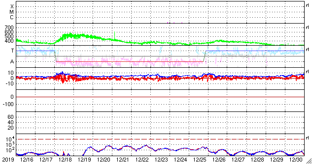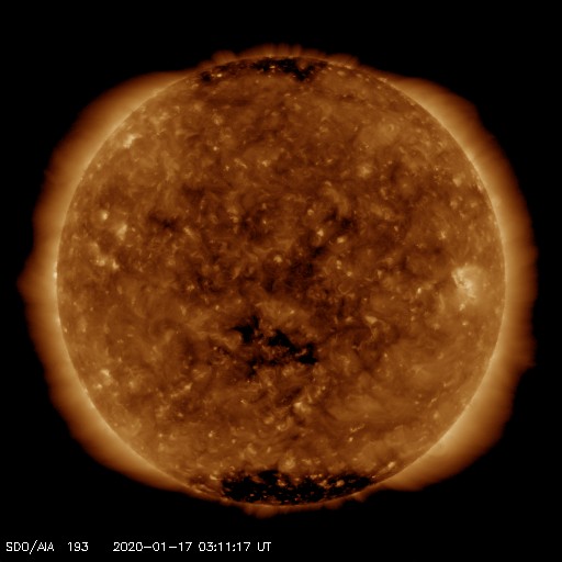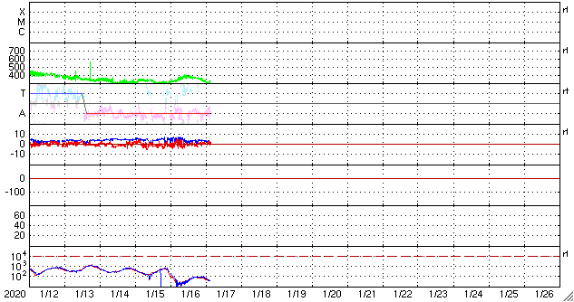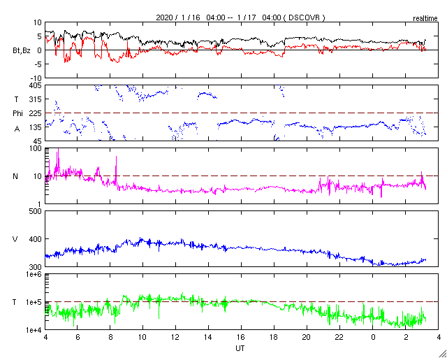 2020/ 1/17 12:21 更新 太陽風の速度は、少し高まって、再び低速に戻っています。 担当 篠原 昨日のニュースの後から夜にかけて、 太陽風の速度は小幅の変化ですが、380km/秒へ高まりました。 その後はゆっくりと下がって、 今朝には310km/秒と昨日と同じくらいの低速風に戻っています。 規模が小さくなった太陽風速度の変化が、 遅れて地球にやって来たのかもしれません。 27日周期の図を見ると、半日程度の変化になっています。 磁場強度は、5nTから3nTへ少し下がり、 やや弱くなっています。 速度が上がっていた頃に、磁場の南向きの変化が少し強まり、 AE指数に500nT程度の小規模の変化を作っています。 その他は磁場の南北成分の変化は小さく、磁気圏も穏やかです。 SDO衛星AIA193では、太陽の中央部の南側に、 ぼんやりとしたコロナホールが見えています。 4日後くらいに、弱い影響が見られるかもしれません。 太陽は、無黒点で穏やかな状態が続いています。