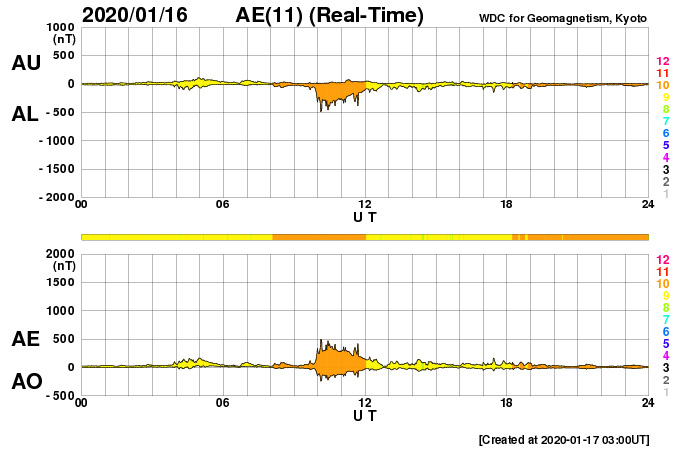 (c) SDO (NASA) ![]() SDO衛星による太陽の可視光写真 (c) SDO (NASA) ![]() DSCOVRが観測した太陽風の磁場(1番上の枠、黒線は全体の強度、赤線は南北成分) および、太陽風の密度(3番目の紫線)、速度(4番目の青線) (c) データ:NOAA/SWPC、作図:宇宙天気ニュース ![]() AE指数(速報値) 下段のAEグラフの値が高くなると、オーロラ活動が活発化しています。 (c) 京都大学WDC ![]() ![]() 27日の太陽周期に合わせたデータプロット 太陽が同じ面を地球に向けていた27日前の変化から、今後を予想することができます。 (c) 作図:宇宙天気ニュース