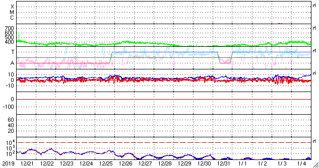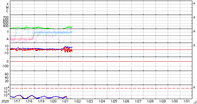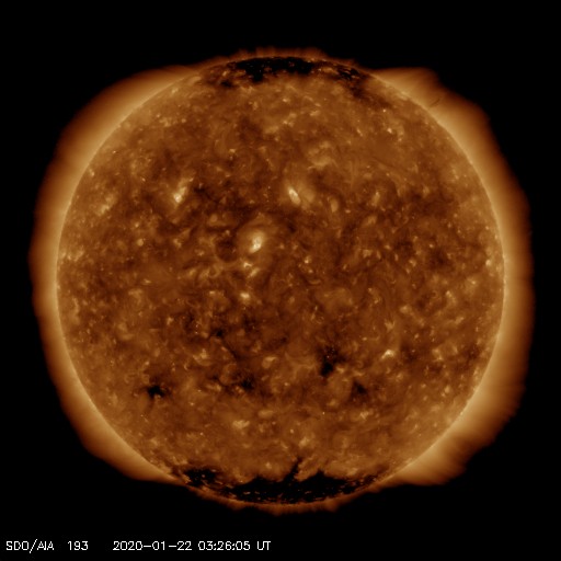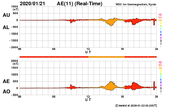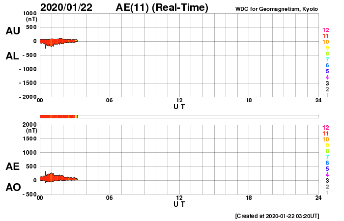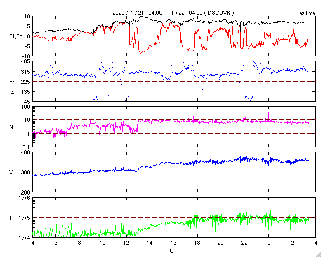 2020/ 1/22 12:39 更新 太陽風の速度が少し上昇しています。低速の状態は続いています。 担当 篠原 昨夜から、太陽風に小さい変化が発生しています。 初めに磁場強度が2nTから8nTに高まって、 やや強まった状態になり、 続いて、速度が300km/秒から360km/秒へ上がっています。 こちらは低速風の範囲の変化です。 17日頃に見えていた淡いコロナホールの影響が、 ゆっくりとやって来たのかもしれません。 27日周期の図を見ると、 前周期も400km/秒程度の速度の高まりが到来しています。 この変化の回帰とも言えそうです。 磁場が強まるとともに、南北の変化がやや大きくなっています。 磁気圏の活動も少し高まって、 AE指数には500nT程度の変化が発生しています。 太陽風の変化は小さい規模に留まりそうです。 この後も、太陽風は穏やかな状態が続きそうです。 太陽は無黒点です。