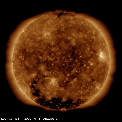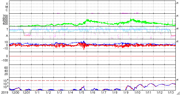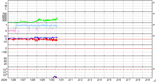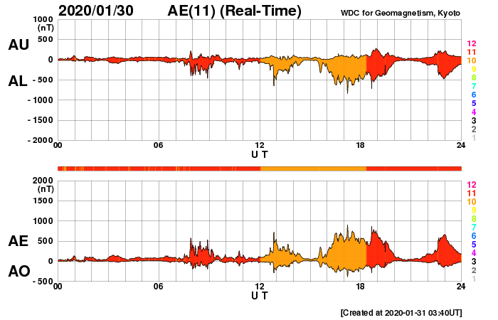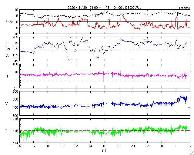 2020/ 1/31 12:47 更新 太陽風の速度が上がり、磁気圏の活動も高まっています。 担当 篠原 太陽風の速度は、昨夜遅くから450km/秒程度にやや上がり、 先程からもう一段高まって、 500km/秒を超えて高速風に変わっています。 磁場強度は5〜7nTと、平均的か少し強いくらいで推移しています。 27日周期の図を見ると、前周期の太陽風では、 1月5〜6日にかけて速度が500km/秒を超える変化が発生していました。 この時の変化が、少し早まって帰ってきたのでしょうか。 太陽風磁場の南北成分は、南向きに振れる時間が長くなっています。 速度が高まってきたこともあり、磁気圏の活動は高まっていて、 AE指数は500〜800nTの中規模の変化が繰り返し発生しています。 引き続き注目してください。 太陽では、2757黒点群が西の端に近付いています。 昨日より少し小さくなっている様です。