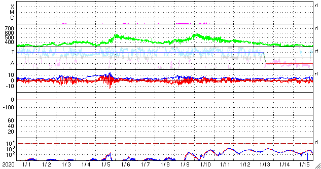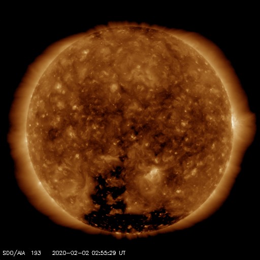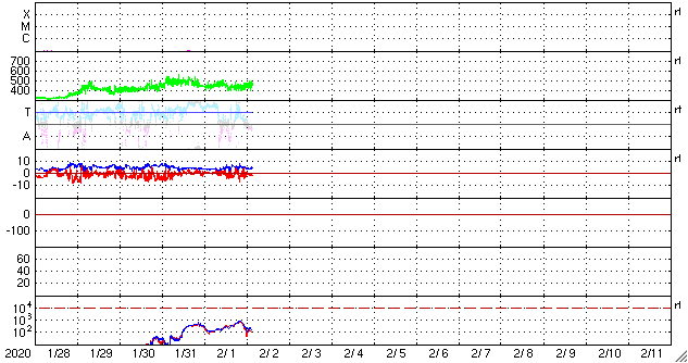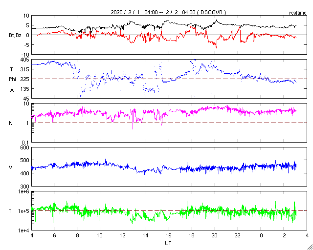 2020/ 2/ 2 12:13 更新 太陽風はやや高速の状態が続いています。太陽は無黒点になりそうです。 担当 篠原 太陽風の速度は、 昨日のニュースの後も450km/秒前後の状態が続いています。 磁場強度は、4〜5nTと平均的な値です。 磁場の南北成分は、南向きにも変化するようになっています。 磁気圏では弱い活動が起きていて、 AE指数は200〜300nTの小規模の変化が 半日ほど続いています。 SDO衛星AIA193では、 南極から低緯度域に向かって伸びるコロナホールが 太陽の中心線くらいまで進んでいます。 緯度が高めですが、3〜4日後の太陽風を強めるでしょうか。 太陽の2757黒点群は、西の端に達していて、 白斑が見えている程度です。 この後、太陽は無黒点になりそうです。