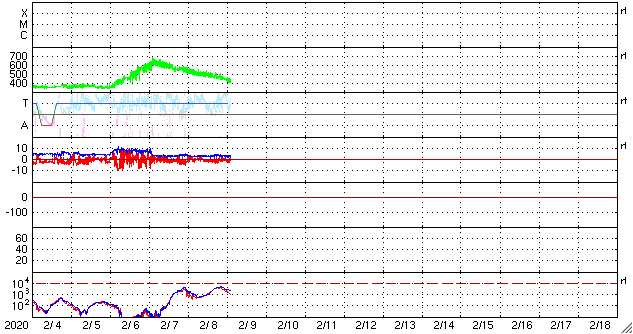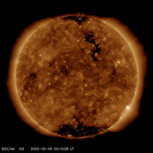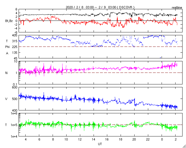 2020/ 2/ 9 11:25 更新 太陽風は平均的な速度に下がっています。太陽は無黒点です。 担当 篠原 太陽風の速度は、昨日のニュースのすぐ後に500km/秒を割り、 更に低下が続いて、現在は430km/秒と平均的な状態に戻っています。 磁場強度は、3nTとやや弱い状態で安定しています。 太陽風の高まりは、2日ほどで終わっています。 太陽風磁場の南北成分は、 太陽風のグラフの中盤から弱い南寄りになっています。 このため、AE指数でも300nT程度の小規模の変化が発生しています。 太陽風の速度がこのまま下がっていくと、 磁気圏の活動はより小さい変化になっていくでしょう。 一方、SDO衛星AIA193では、 北半球の縦に伸びるコロナホールが太陽の西側に進んでいます。 明後日くらいにこの領域の弱い影響が見られるかもしれません。 太陽では、昨日小さい黒点が見えていた領域が、 南西の端に近付いています。 今日の写真では、黒点は見えていない様です。 その他に活動的な領域はなく、太陽は穏やかです。 ![]() SDO衛星のAIA193カメラによる太陽コロナの様子 (c) SDO (NASA) ![]() SDO衛星による太陽の可視光写真 (c) SDO (NASA) ![]() DSCOVRが観測した太陽風の磁場(1番上の枠、黒線は全体の強度、赤線は南北成分) および、太陽風の密度(3番目の紫線)、速度(4番目の青線) (c) データ:NOAA/SWPC、作図:宇宙天気ニュース ![]() AE指数(速報値) 下段のAEグラフの値が高くなると、オーロラ活動が活発化しています。 (c) 京都大学WDC ![]() ![]() 27日の太陽周期に合わせたデータプロット 太陽が同じ面を地球に向けていた27日前の変化から、今後を予想することができます。 (c) 作図:宇宙天気ニュース
