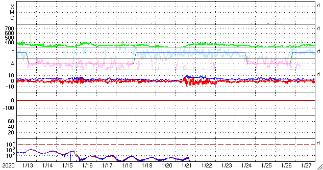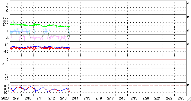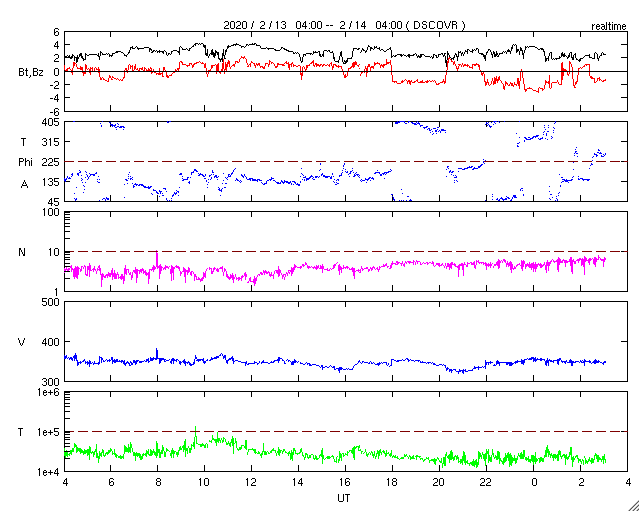 2020/ 2/14 12:17 更新 太陽風は低速で、磁気圏も穏やかです。無黒点が続いています。 担当 篠原 太陽風の速度は、350km/秒と低速の状態で安定しています。 磁場強度も、2〜4nTとやや弱い状態で推移しています。 磁場の南北成分は、 グラフの最後で小さく南向きに変化している程度です。 磁気圏は静穏で、AE指数はほとんど変化していません。 SDO衛星AIA193は、 太陽の中央部にぼんやりとしたコロナホールが見えている程度で、 太陽風はこの後も穏やかな状態が続きそうです。 27日周期の図では、 前周期のグラフの右端まで低速の太陽風が続いています。 太陽は、今日も無黒点です。 SDO衛星AIA193では、明るく光る点もほとんどありません。 X線グラフは、静かな状態が続いています。 ![]() SDO衛星のAIA193カメラによる太陽コロナの様子 (c) SDO (NASA) ![]() SDO衛星による太陽の可視光写真 (c) SDO (NASA) ![]() DSCOVRが観測した太陽風の磁場(1番上の枠、黒線は全体の強度、赤線は南北成分) および、太陽風の密度(3番目の紫線)、速度(4番目の青線) (c) データ:NOAA/SWPC、作図:宇宙天気ニュース ![]() AE指数(速報値) 下段のAEグラフの値が高くなると、オーロラ活動が活発化しています。 (c) 京都大学WDC ![]() ![]() 27日の太陽周期に合わせたデータプロット 太陽が同じ面を地球に向けていた27日前の変化から、今後を予想することができます。 (c) 作図:宇宙天気ニュース
