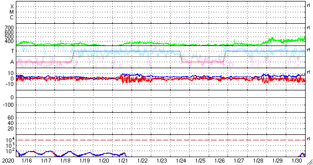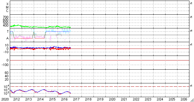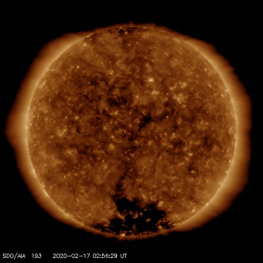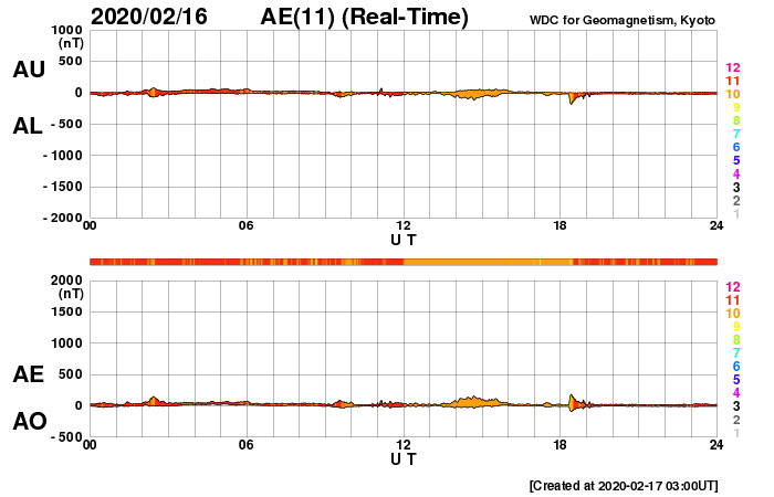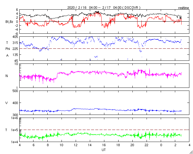 2020/ 2/17 12:03 更新 太陽風は低速の風が続いています。磁気圏も静穏です。 担当 篠原 太陽風の速度は少し下がって、330km/秒付近になっています。 低速の状態が続いています。 磁場強度も、3〜4nTとやや弱い値です。 磁気圏は静穏で、 AE指数はほとんど変化のない状態です。 SDO衛星AIA193では、 南極側からコロナホールが細長く縦に伸びています。 しかし、低緯度域の広がりはほとんどなく、 太陽風への影響は見られないままかもしれません。 27日周期の図では、前周期のグラフの最後に、 次の太陽風の高まりが見え始めています。 このまま回帰すると考えると、 来週の2月25日くらいから 太陽風の高まりが始まるかもしれません。 太陽は無黒点です。 静かな状態が続いています。