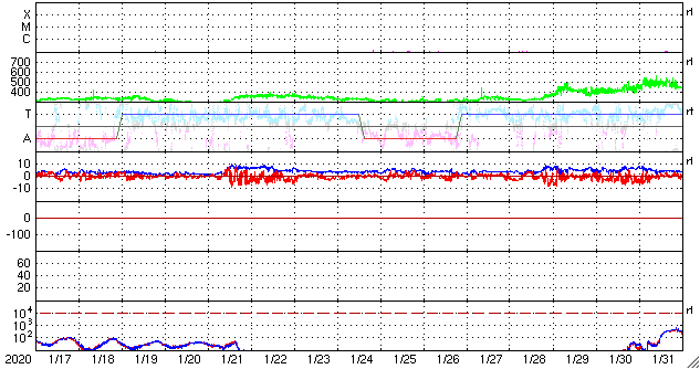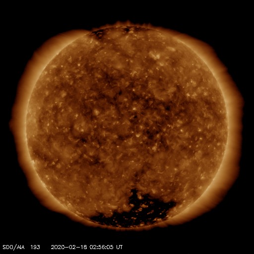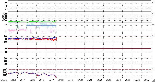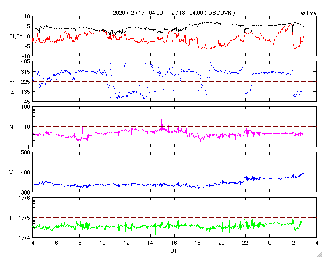 2020/ 2/18 12:03 更新 太陽風は低速ですが、速度が少し上がっています。太陽は無黒点が続いています。 担当 篠原 太陽風は低速の風が続いていますが、 今朝くらいから速度が少し上がって、 現在、380km/秒と平均的な状態に近くなっています。 磁場強度も、小幅ですが4nTから6nTへ少し上がっています。 大きな変化になることはなさそうですが、 どのくらいまで速度が上がるのか、この後も注目してください。 太陽風磁場の南北成分は、磁場強度が少し上がったこともあり、 -5nT程度の南向きの変化が発生する様になっています。 このため、磁気圏の活動も少し高まって、 AE指数には、300〜500nTの変化が発生しています。 太陽風が現在の様な状態であれば、 この後も、磁気圏の活動が見られそうです。 一方、SDO衛星AIA193では、 太陽の低緯度域にコロナホールは見えません。 基本的には、太陽風は穏やかな風が続きそうです。 太陽は、無黒点で穏やかな状態が続いています。 ![]() SDO衛星のAIA193カメラによる太陽コロナの様子 (c) SDO (NASA) ![]() SDO衛星による太陽の可視光写真 (c) SDO (NASA) ![]() DSCOVRが観測した太陽風の磁場(1番上の枠、黒線は全体の強度、赤線は南北成分) および、太陽風の密度(3番目の紫線)、速度(4番目の青線) (c) データ:NOAA/SWPC、作図:宇宙天気ニュース ![]() AE指数(速報値) 下段のAEグラフの値が高くなると、オーロラ活動が活発化しています。 (c) 京都大学WDC ![]() ![]() 27日の太陽周期に合わせたデータプロット 太陽が同じ面を地球に向けていた27日前の変化から、今後を予想することができます。 (c) 作図:宇宙天気ニュース