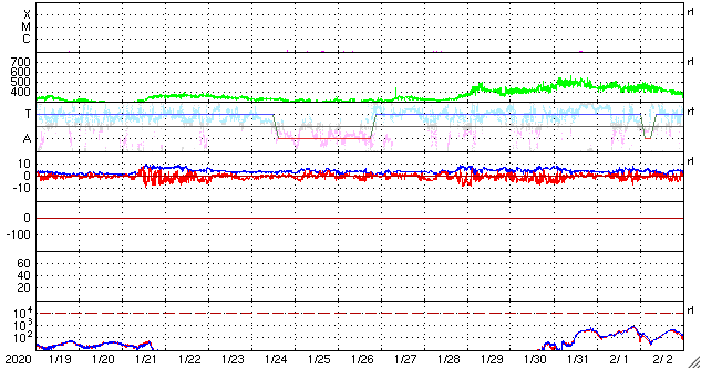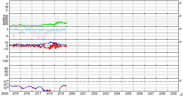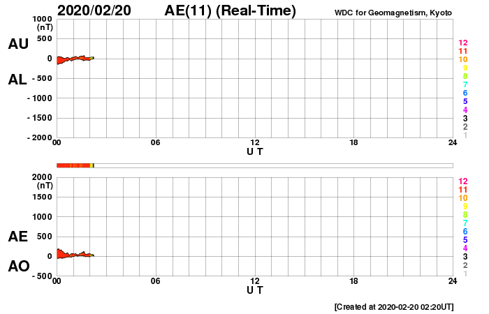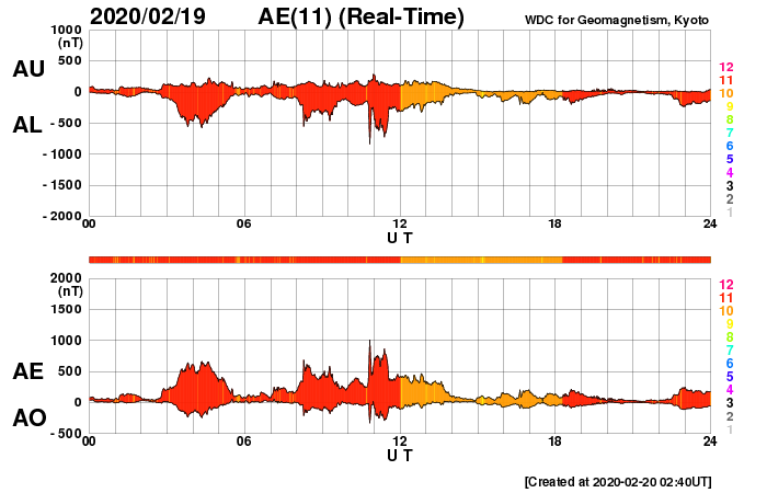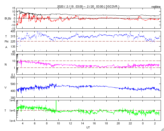 - 2020/ 2/19 12:44 太陽風磁場が南向きに振れ続け、小さい磁気嵐になりました。