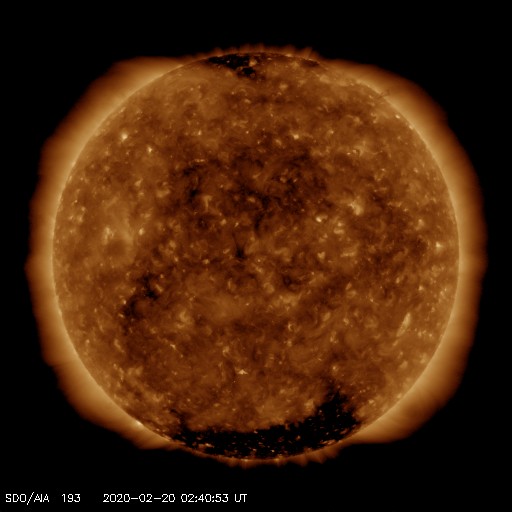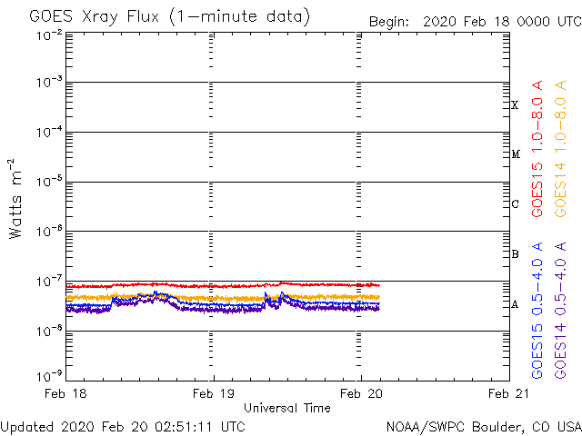 - 2020/ 2/18 12:03 太陽風は低速ですが、速度が少し上がっています。太陽は無黒点が続いています。