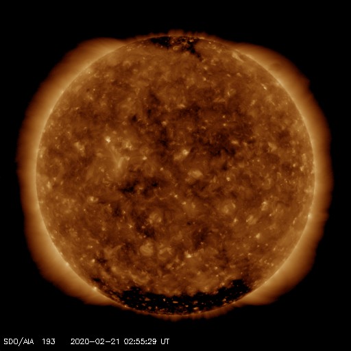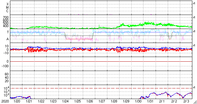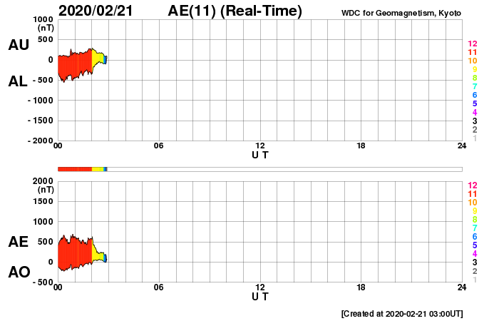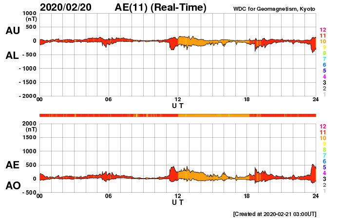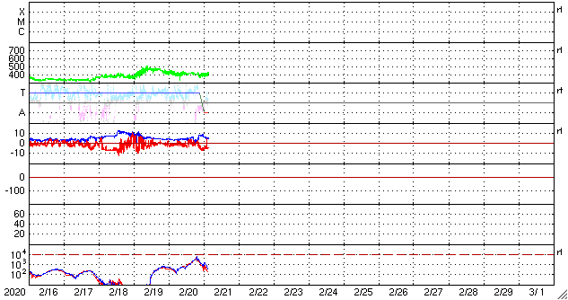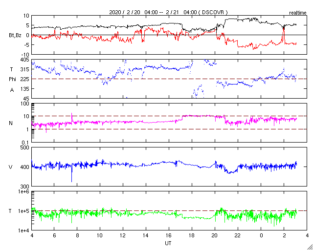 2020/ 2/21 12:15 更新 太陽風磁場が南向きに振れ続けて、磁気圏の活動を高めています。 担当 篠原 今朝くらいから、太陽風磁場が南向きに振れ続けています。 このため、磁気圏の活動もやや高まった状態になっています。 現在の太陽風は、速度は400km/秒、磁場強度は5nT前後と、 平均的な状態です。 磁場の南北成分も、 昨日から今朝までは、南北に小さく変化する程度だったのですが、 21日6時(世界時20日21時)くらいから南向きに偏るようになり、 -5nT程度の変化が6時間ほど続いています。 その影響はAE指数にも表れていて、 20日のグラフは、300nTの小規模の変化が時々起きる程度ですが、 21日に入る頃から、 500nTを少し超えるくらいの中規模の変化が続いています。 太陽風磁場の変化はどこまで続くでしょうか。 注目してください。 太陽は無黒点で、 静かな状態が続いています。