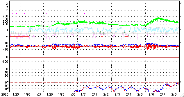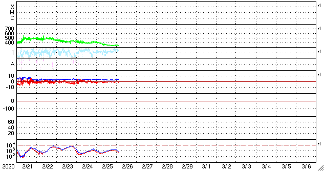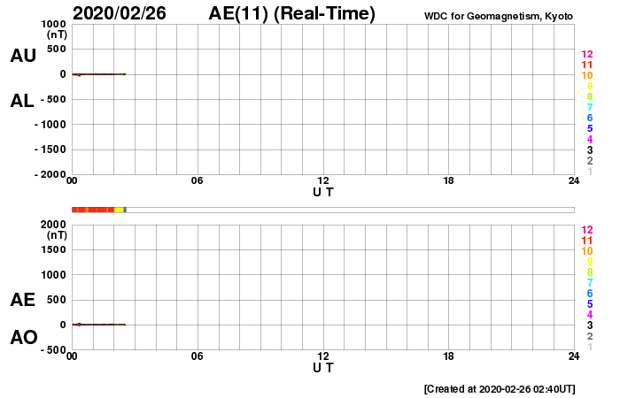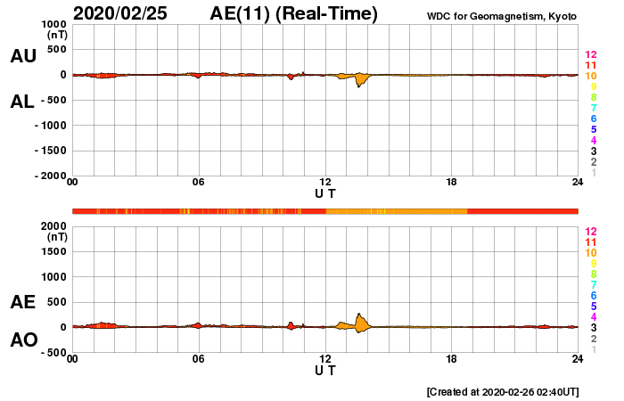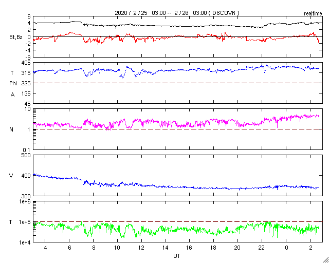 2020/ 2/26 11:58 更新 太陽風は低速になり、磁気圏も静穏です。 担当 篠原 太陽風の速度は、昨日の夕方くらいに350km/秒へ下がり、 現在も340km/秒と低速の状態が続いています。 磁場強度も、3〜4nTとやや弱くなっています。 磁場の南北成分は、0nT付近で小さく変化する程度です。 速度も下がり、磁気圏はかなり静かになっています。 AE指数は、小さい変化がひとつ見える程度で、 その他はほとんど変化のない状態です。 27日周期の図では、 前周期の太陽風は速度が400km/秒台に高まっていたのですが、 今回は反対に300km/秒台に下がっています。 この後はどの様に推移するでしょうか。 太陽は無黒点です。 今月の黒点相対数は、再びかなり低い値になりそうです。 STEREO Ahead衛星を見ると、 太陽の東端の少し奥に活動的な領域があります。 こちらに見えてくるのは、2〜3日後となりそうです。