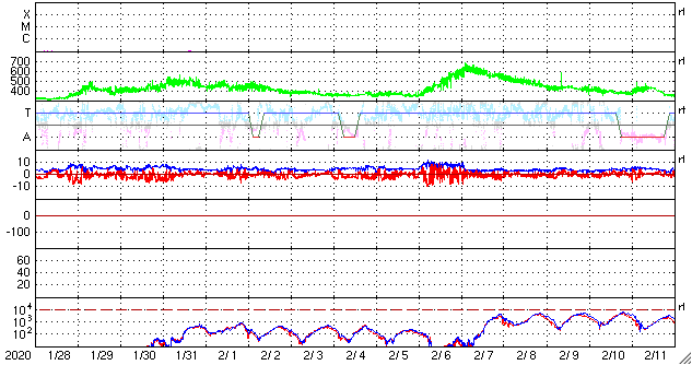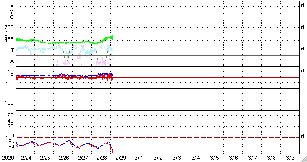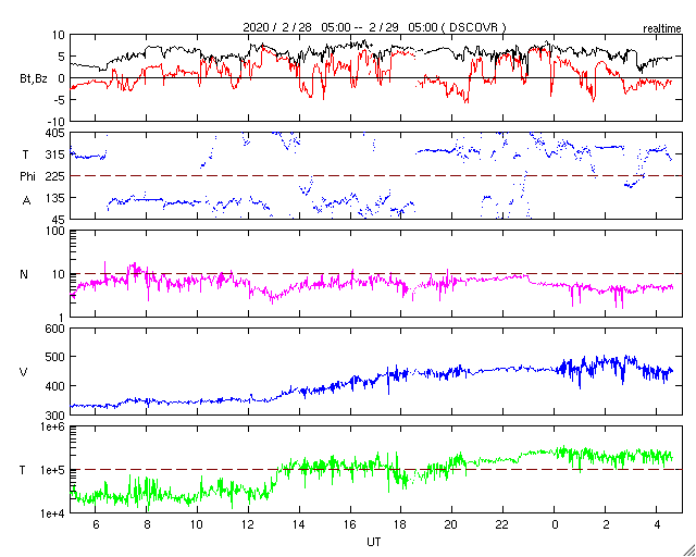 2020/ 2/29 13:43 更新 太陽風の速度はやや高速になっています。フィンランドのオーロラをどうぞ。 担当 篠原 高坂雄一さんより、フィンランド北部のサーリセルカで 現地25日夜(日本時間26日未明)に撮影された オーロラの写真をいただきました。 太陽風の速度は350km/秒と低速で、 AE指数のグラフもほとんど変化がない、静かな頃です。 高坂さんによると、 なんとか北の空にオーロラを見ることができたとのことです。 空の低い所に、細くたなびくように光っていて、 オーロラの活動度の低さが感じられます。 1枚目のオーロラの上には、 はくちょうからカシオペヤにかけての天の川が見えています。 左側の中程には、アンドロメダ大星雲も写っています。 最近の宇宙天気らしいオーロラの見え方かもしれません。 どうもありがとうございます。 この写真は、26日朝に速報としていただいていたのですが、 私の都合で掲載が3日遅れになりました。 太陽風は、昨夜から速度が上昇を始め、 今日の未明に450km/秒とやや高速の状態になっています。 磁場強度も、昨日の午後から7nT程度にやや強まっていました。 現在は5nTへ少し下がっています。 前周期の太陽風速度の高まりが、 このタイミングで回帰して来たのかもしれません。 太陽風磁場の南北成分は、北寄りになっています。 このため、磁気圏は穏やかなままで、 AE指数は、小規模の変化が見られる程度です。 太陽風速度の高まりは、この後も続くでしょうか。 太陽は、無黒点で穏やかです。 鹿児島高専は、今日から春休みです。 昨日までは、1年間の成績の取りまとめで大忙しでした。 ![]() フィンランド北部のサーリセルカで、現地25日夜に撮影されたオーロラ。 (c) 高坂雄一氏 ![]() フィンランド北部のサーリセルカで、現地25日夜に撮影されたオーロラ。 (c) 高坂雄一氏 ![]() フィンランド北部のサーリセルカで、現地25日夜に撮影されたオーロラ。 (c) 高坂雄一氏 ![]() SDO衛星のAIA193カメラによる太陽コロナの様子 (c) SDO (NASA) ![]() SDO衛星による太陽の可視光写真 (c) SDO (NASA) ![]() DSCOVRが観測した太陽風の磁場(1番上の枠、黒線は全体の強度、赤線は南北成分) および、太陽風の密度(3番目の紫線)、速度(4番目の青線) (c) データ:NOAA/SWPC、作図:宇宙天気ニュース ![]() AE指数(速報値) 下段のAEグラフの値が高くなると、オーロラ活動が活発化しています。 (c) 京都大学WDC ![]() ![]() 27日の太陽周期に合わせたデータプロット 太陽が同じ面を地球に向けていた27日前の変化から、今後を予想することができます。 (c) 作図:宇宙天気ニュース