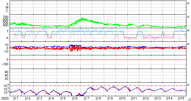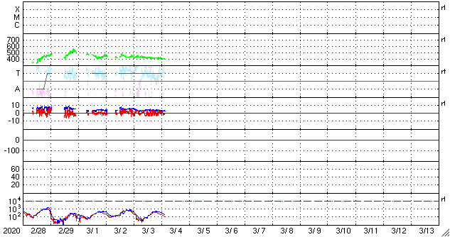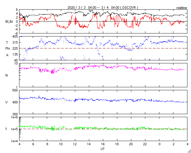 2020/ 3/ 4 12:49 更新 太陽風は平均的な速さが続いています。 担当 篠原 太陽風の速度は、 430km/秒から400km/秒へ少し下がっていますが、 平均的な速さが続いています。 磁場強度は、3〜4nTとやや弱くなっています。 磁場の南北成分は、グラフの中盤で南北の変化が目立っています。 このため磁気圏の活動もやや高まって、 AE指数では、200〜500nTの小規模の変化が 繰り返し発生しています。 今朝くらいからは、磁場の南北の変化は目立たない様になっていて、 AE指数のグラフも、終わりの頃は変化が見られなくなっています。 27日周期の図を見ると、 前周期の太陽風はこれから速度が高まっています。 今回はどうなるでしょうか。 太陽は無黒点です。 穏やかな状態が続いています。 ![]() SDO衛星のAIA193カメラによる太陽コロナの様子 (c) SDO (NASA) ![]() SDO衛星による太陽の可視光写真 (c) SDO (NASA) ![]() DSCOVRが観測した太陽風の磁場(1番上の枠、黒線は全体の強度、赤線は南北成分) および、太陽風の密度(3番目の紫線)、速度(4番目の青線) (c) データ:NOAA/SWPC、作図:宇宙天気ニュース ![]() AE指数(速報値) 下段のAEグラフの値が高くなると、オーロラ活動が活発化しています。 (c) 京都大学WDC ![]() ![]() 27日の太陽周期に合わせたデータプロット 太陽が同じ面を地球に向けていた27日前の変化から、今後を予想することができます。 (c) 作図:宇宙天気ニュース