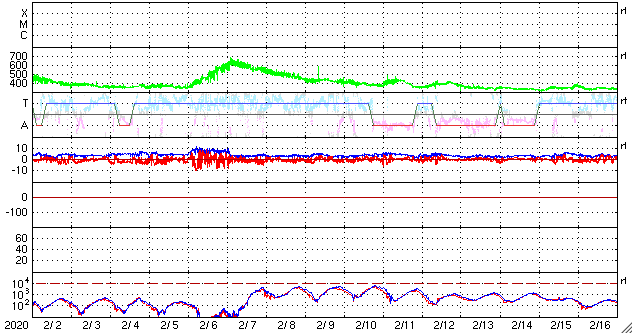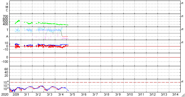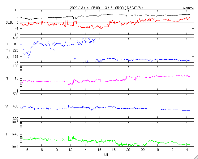 2020/ 3/ 5 13:37 更新 太陽風はやや低速になっています。アイスランドのオーロラをどうぞ。 担当 篠原 高坂雄一さんより、アイスランドで現地2日の深夜に撮影された オーロラの写真をいただきました。 アイスランドは天候が悪かったそうで、北西のフィヨルド地方へ行き、 3晩目にやっとオーロラに出会えたそうです。 2日の23時以降に出始めて、 午前2時を過ぎてもずっと出ている状態だったとのことです。 月が明るく、フィヨルドが映えたとのことです。 3枚目は連続写真になっています。 この頃の太陽風は平均的な状態で、 AE指数も小さい変化が起きている程度と、 穏やかな状況で撮影されたオーロラです。 1枚目は、左側の中程にカシオペヤ座があり、 中央少し左寄りの上端近くに北極星が見えています。 2枚目は、月のすぐ上にぎょしゃ座の五角形があり、 オーロラが一番光っている辺りにカシオペヤ座が見えています。 星座と対応させながら写真を見ると、 夜空での大きさを想像しやすくなります。 素敵な雰囲気の写真をありがとうございます。 太陽風は、速度が370km/秒へ下がり、やや低速になっています。 磁場強度は、4nTから6nTへ少し上がっていますが、平均的な状態です。 磁場の南北成分は、グラフの中央部で南向きの変化が続いていて、 AE指数も300〜500nTの小規模の変化が発生しています。 その後は、磁場は北寄りになり、磁気圏も静かになっています。 27日周期の図を見ると、前周期の太陽風は速度が高まりましたが、 今回は穏やかなまま推移しています。 一方、SDO衛星AIA193の太陽コロナ写真では、 南極のコロナホールがやや迫り出していることと、 赤道域に淡いコロナホールが見えています。 これからこの影響がやって来るかもしれません。 太陽は、無黒点で穏やかです。 ![]() アイスランドで現地2日深夜に撮影されたオーロラ。 (c) 高坂雄一氏 ![]() アイスランドで現地2日深夜に撮影されたオーロラ。 (c) 高坂雄一氏 ![]() アイスランドで現地2日深夜に撮影されたオーロラ。 (c) 高坂雄一氏 ![]() SDO衛星のAIA193カメラによる太陽コロナの様子 (c) SDO (NASA) ![]() SDO衛星による太陽の可視光写真 (c) SDO (NASA) ![]() DSCOVRが観測した太陽風の磁場(1番上の枠、黒線は全体の強度、赤線は南北成分) および、太陽風の密度(3番目の紫線)、速度(4番目の青線) (c) データ:NOAA/SWPC、作図:宇宙天気ニュース ![]() AE指数(速報値) 下段のAEグラフの値が高くなると、オーロラ活動が活発化しています。 (c) 京都大学WDC ![]() ![]() 27日の太陽周期に合わせたデータプロット 太陽が同じ面を地球に向けていた27日前の変化から、今後を予想することができます。 (c) 作図:宇宙天気ニュース