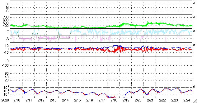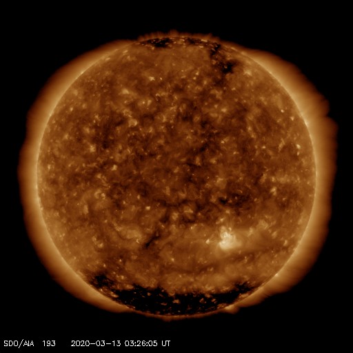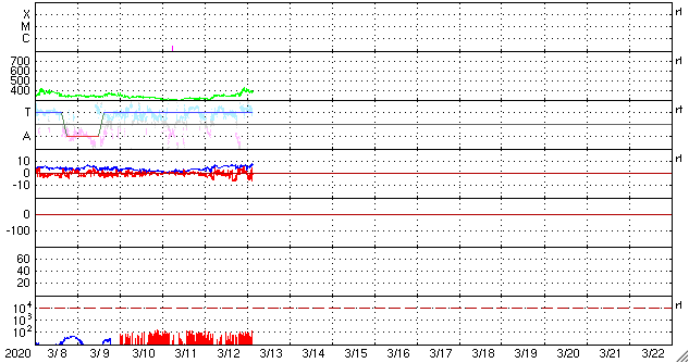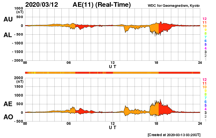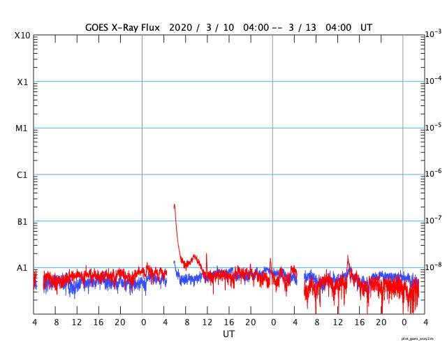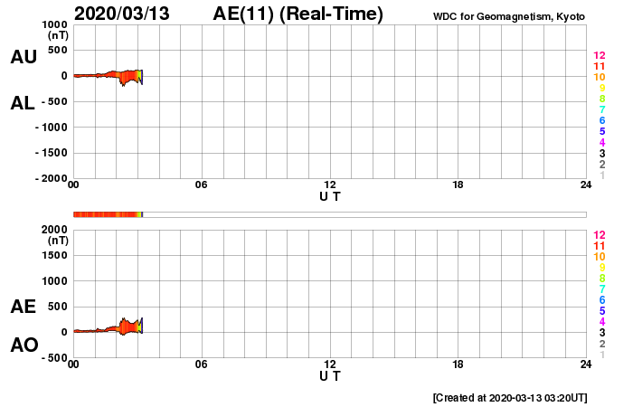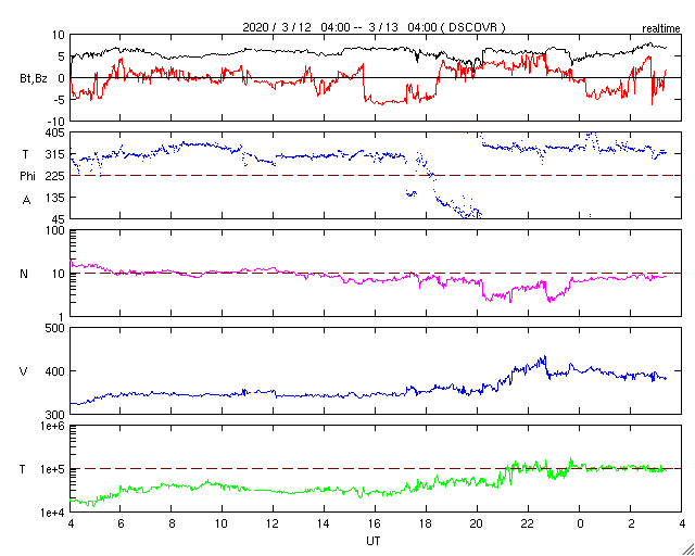 2020/ 3/13 12:31 更新 太陽風は平均的な速さに上がっています。 担当 篠原 太陽風の速度は、昨日のニュースの後に350km/秒へ少し高まり、 さらに、今朝には400km/秒へ再度高まって、 平均的な速さに達しています。 磁場強度は、5nT前後と平均的な状態です。 磁場の南北成分は、グラフの途中と終わり近くで、 -5nT程度の南向きの変化が到来しています。 磁気圏の活動もこれに合わせて高まって、 AE指数には、700nTの中規模の活動が発生しています。 この後も太陽風磁場の南向きの変化が続けば、 磁気圏の活動もある程度高まりそうです。 一方、SDO衛星AIA193では、 太陽の低緯度域にはコロナホールは見えていません。 このため、太陽風は基本的には穏やかな状態が続きそうです。 太陽は無黒点です。 X線グラフも変化はなく、穏やかです。