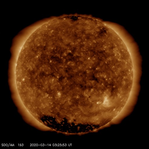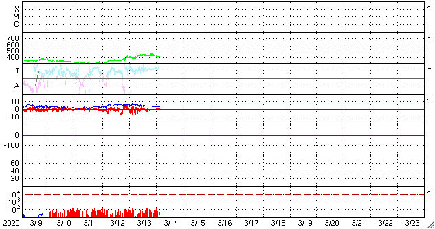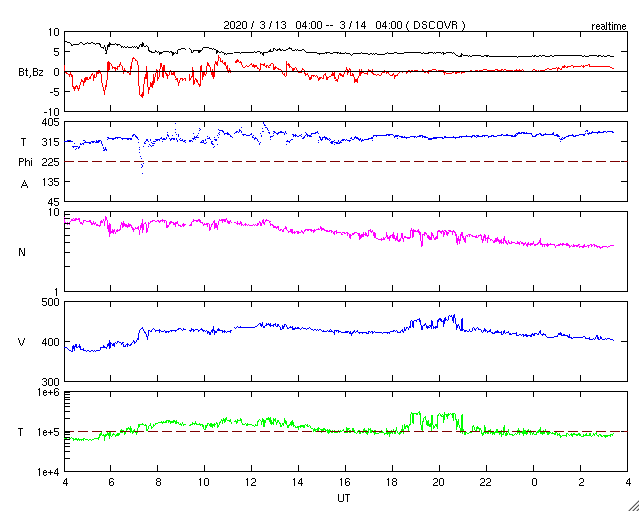 2020/ 3/14 12:31 更新 太陽風は平均的な速度が続いています。太陽は無黒点です。 担当 篠原 太陽風の速度は、 昨日の午後に430km/秒へ少し上がりましたが、 今朝くらいから400km/秒に戻っています。 平均的な速度が続いています。 磁場強度は、6nTから4nTへ下がり気味です。 磁場の南北成分は、 グラフの前半は南向きにやや強まる変化が見られますが、 後半は0nT付近で小さくなっています。 AE指数も同様に、前半は小規模の変化が続いていますが、 後半は穏やかになっています。 SDO衛星AIA193では、低緯度域にコロナホールはなく、 太陽風は穏やかな状態が続きそうです。 太陽は、無黒点で穏やかです。 ![]() SDO衛星のAIA193カメラによる太陽コロナの様子 (c) SDO (NASA) ![]() SDO衛星による太陽の可視光写真 (c) SDO (NASA) ![]() DSCOVRが観測した太陽風の磁場(1番上の枠、黒線は全体の強度、赤線は南北成分) および、太陽風の密度(3番目の紫線)、速度(4番目の青線) (c) データ:NOAA/SWPC、作図:宇宙天気ニュース ![]() AE指数(速報値) 下段のAEグラフの値が高くなると、オーロラ活動が活発化しています。 (c) 京都大学WDC ![]() ![]() 27日の太陽周期に合わせたデータプロット 太陽が同じ面を地球に向けていた27日前の変化から、今後を予想することができます。 (c) 作図:宇宙天気ニュース