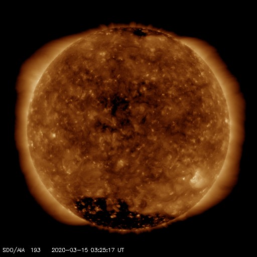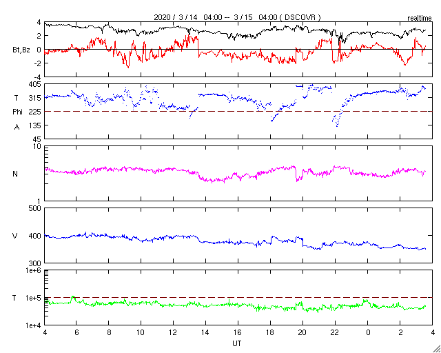 2020/ 3/15 12:43 更新 太陽風は低速になっています。 担当 篠原 太陽風の速度は、400km/秒から350km/秒へゆっくりと下がり、 低速の風になっています。 磁場強度も2〜3nTに下がり、弱くなっています。 磁気圏も穏やかで、 AE指数は時々小さい変化が起きている程度です。 SDO衛星AIA193では、 低緯度域にコロナホールは見られず、 太陽風は穏やかな状態が続きそうです。 一方、27日周期の図を見ると、 前周期の太陽風は、2月19日以降速度がやや高まっています。 この頃もコロナホールは見られず、 速度の高まりが突然やって来た印象でした。 今回はどの様な推移になるでしょうか。 太陽は、無黒点で穏やかな状態が続いています。 ![]() SDO衛星のAIA193カメラによる太陽コロナの様子 (c) SDO (NASA) ![]() SDO衛星による太陽の可視光写真 (c) SDO (NASA) ![]() DSCOVRが観測した太陽風の磁場(1番上の枠、黒線は全体の強度、赤線は南北成分) および、太陽風の密度(3番目の紫線)、速度(4番目の青線) (c) データ:NOAA/SWPC、作図:宇宙天気ニュース ![]() AE指数(速報値) 下段のAEグラフの値が高くなると、オーロラ活動が活発化しています。 (c) 京都大学WDC ![]() ![]() 27日の太陽周期に合わせたデータプロット 太陽が同じ面を地球に向けていた27日前の変化から、今後を予想することができます。 (c) 作図:宇宙天気ニュース
