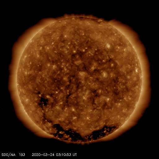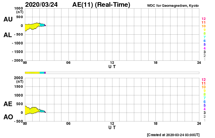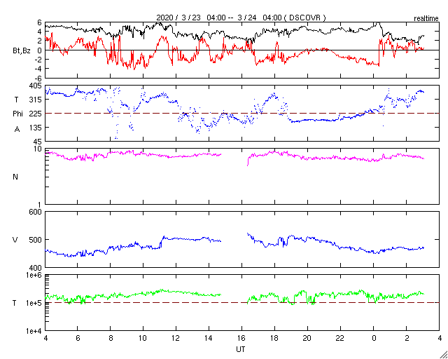 2020/ 3/24 12:18 更新 太陽風はやや高速の状態が続いています。 担当 篠原 太陽風の速度は、450km/秒から500km/秒に上がり、 再び460km/秒へ下がるという小さい変化をしています。 やや高速の状態が続いています。 磁場強度は、3〜5nT程度で変化しています。 南北成分は、南寄りで変化しています。 このため、磁気圏はある程度活動的な状態が続いていて、 AE指数は、700nTの中規模の変化も発生しています。 グラフの最後で、磁場の南北成分は0nT付近に変わっています。 南寄りの傾向が終われば、磁気圏は穏やかになるでしょう。 また、今回の太陽風速度の高まりはどこまで続くでしょうか。 太陽は、無黒点で穏やかです。 ![]() SDO衛星のAIA193カメラによる太陽コロナの様子 (c) SDO (NASA) ![]() SDO衛星による太陽の可視光写真 (c) SDO (NASA) ![]() DSCOVRが観測した太陽風の磁場(1番上の枠、黒線は全体の強度、赤線は南北成分) および、太陽風の密度(3番目の紫線)、速度(4番目の青線) (c) データ:NOAA/SWPC、作図:宇宙天気ニュース ![]() AE指数(速報値) 下段のAEグラフの値が高くなると、オーロラ活動が活発化しています。 (c) 京都大学WDC ![]() ![]() 27日の太陽周期に合わせたデータプロット 太陽が同じ面を地球に向けていた27日前の変化から、今後を予想することができます。 (c) 作図:宇宙天気ニュース