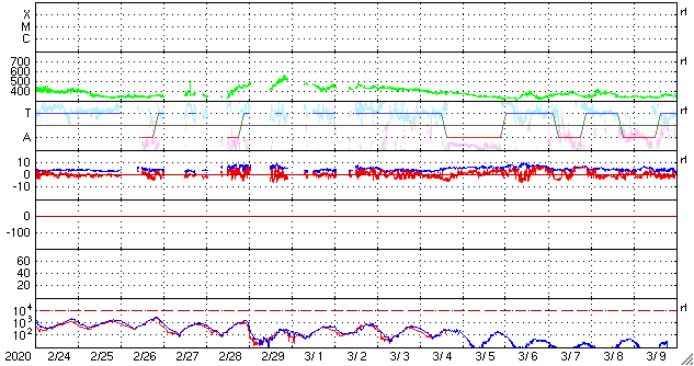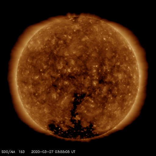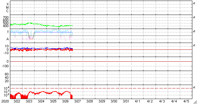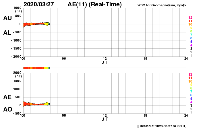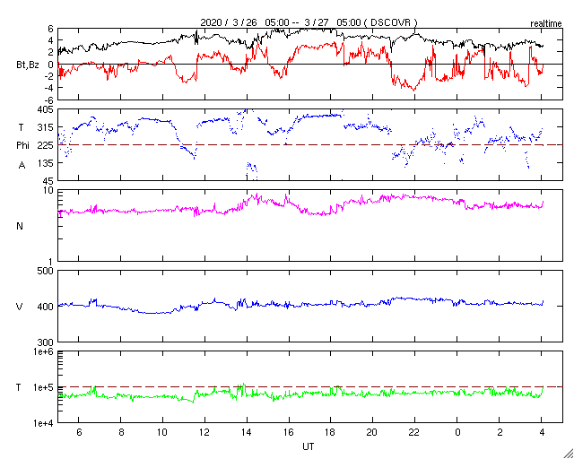 2020/ 3/27 13:15 更新 太陽風は平均的な速度が続いています。 担当 篠原 太陽風の速度は、400km/秒で安定しています。 磁場強度も、4nT前後で推移しています。 太陽風は平均的な状態です。 太陽風磁場の南北成分は、 南に振れたり北に振れたりしています。 AE指数は小規模の変化がぽつぽつ起きている程度で、 磁気圏は全体としては穏やかです。 27日周期の図では、 前周期の太陽風は速度が高まり始めていますが、 現在は特に変化はありません。 今回はこのまま穏やかに過ぎていくのでしょうか。 また、SDO衛星AIA193では、 南極から縦に細長く伸びるコロナホールが、 ちょうど太陽の中央線に達しています。 3日後くらいの太陽風に影響が現れるかもしれません。 太陽は、無黒点で穏やかです。 今月も黒点はほとんど現れないままになりそうです。