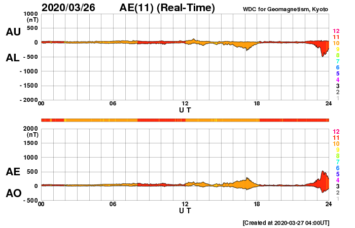 (c) SDO (NASA) ![]() SDO衛星による太陽の可視光写真 (c) SDO (NASA) ![]() DSCOVRが観測した太陽風の磁場(1番上の枠、黒線は全体の強度、赤線は南北成分) および、太陽風の密度(3番目の紫線)、速度(4番目の青線) (c) データ:NOAA/SWPC、作図:宇宙天気ニュース ![]() AE指数(速報値) 下段のAEグラフの値が高くなると、オーロラ活動が活発化しています。 (c) 京都大学WDC ![]() ![]() 27日の太陽周期に合わせたデータプロット 太陽が同じ面を地球に向けていた27日前の変化から、今後を予想することができます。 (c) 作図:宇宙天気ニュース