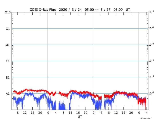 GOES衛星の太陽X線強度。赤・橙 = 0.1〜0.8 nm、青・紫 = 0.05〜0.4 nm (c) データ:NOAA/SWPC、作図:宇宙天気ニュース ![]() | ||||||||||||||||||||||||||||||||||||||||||||||||||||||||||||||||||||||||||||||||||||||||||||||||||||||||||||||||||||||||||||||||||||||||||||||||||||||||||||||||||||||||||||||||||||||||||||||||||||||||||||||