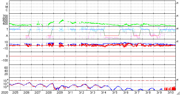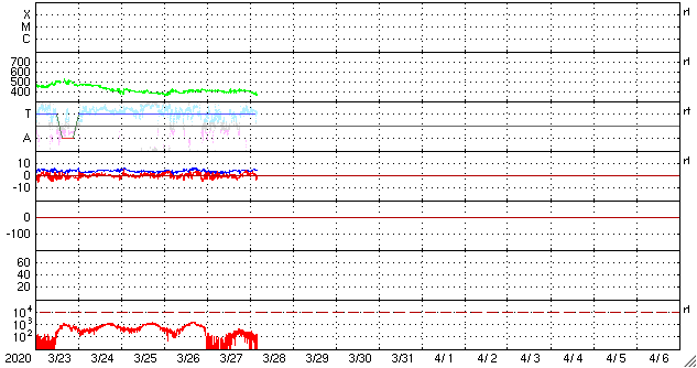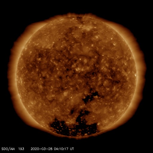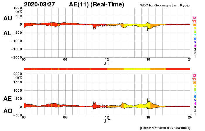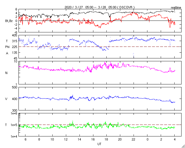 2020/ 3/28 13:20 更新 太陽風はやや低速になっています。 担当 篠原 太陽風の速度は、今朝まで400km/秒の状態が続きましたが、 グラフの最後で少し下がって、現在は370km/秒とやや低速です。 磁場強度は、3nTから5nTにゆっくり上がっています。 こちらは平均的な状態です。 磁場の南北成分は、小さく南向きに変化する程度です。 磁気圏は穏やかで、 AE指数は小規模の変化が時々起きている程度です。 SDO衛星AIA193では、 南半球のコロナホールが西側に進んでいます。 明後日くらいに、この領域の影響がやって来るかもしれません。 太陽は無黒点です。 穏やかな状態が続いています。