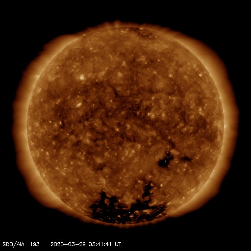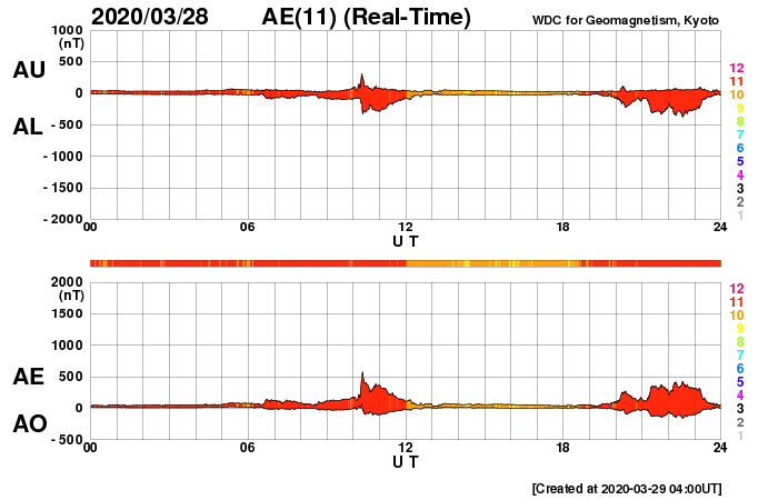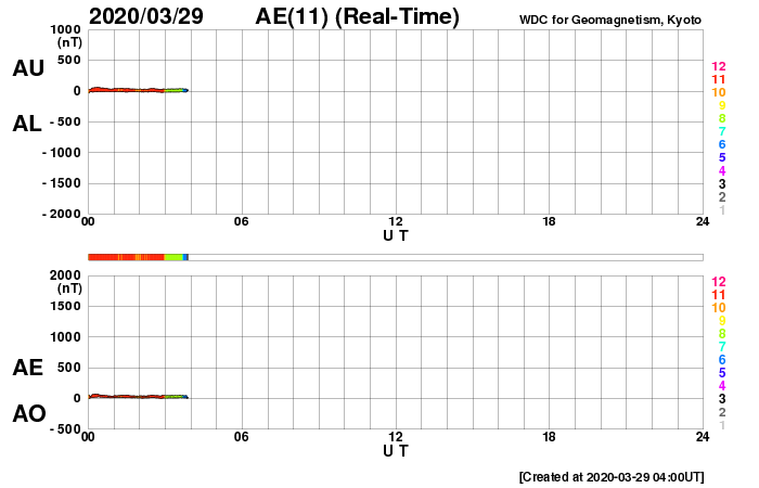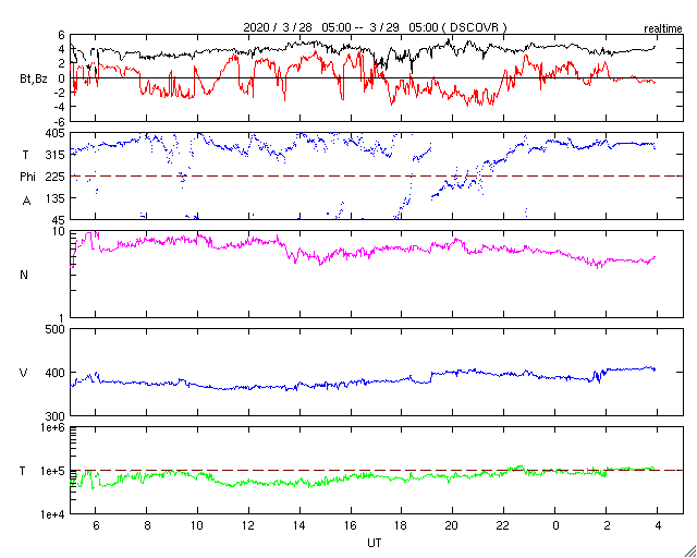 2020/ 3/29 13:02 更新 太陽風は平均的な状態です。磁気圏も概ね静穏です。 担当 篠原 太陽風の速度は、370km/秒から400km/秒へゆっくり上がり、 平均的な速さに戻っています。 磁場強度も4nT程度と平均的な状態です。 磁場の南北成分は、弱い南向きになる時間帯があり、 AE指数に400〜500nTの小規模の変化が発生しています。 全体としては、磁気圏は穏やかです。 27日周期の図で前周期の2月29日〜3月1日に見られた 太陽風速度の高まりは、今回は到来していません。 一方、SDO衛星の南半球のコロナホールは更に西に進んでいます。 明日くらいからこの影響がやって来るかもしれません。 太陽は無黒点が続いています。 SDO衛星AIA193の北東側(左上)に明るい点が見えていますが、 ここに小さい磁場の強まりが現れています。 この後さらに強まって、黒点が発生するでしょうか。 ![]() SDO衛星のAIA193カメラによる太陽コロナの様子 (c) SDO (NASA) ![]() SDO衛星による太陽の可視光写真 (c) SDO (NASA) ![]() DSCOVRが観測した太陽風の磁場(1番上の枠、黒線は全体の強度、赤線は南北成分) および、太陽風の密度(3番目の紫線)、速度(4番目の青線) (c) データ:NOAA/SWPC、作図:宇宙天気ニュース ![]() AE指数(速報値) 下段のAEグラフの値が高くなると、オーロラ活動が活発化しています。 (c) 京都大学WDC ![]() ![]() 27日の太陽周期に合わせたデータプロット 太陽が同じ面を地球に向けていた27日前の変化から、今後を予想することができます。 (c) 作図:宇宙天気ニュース
