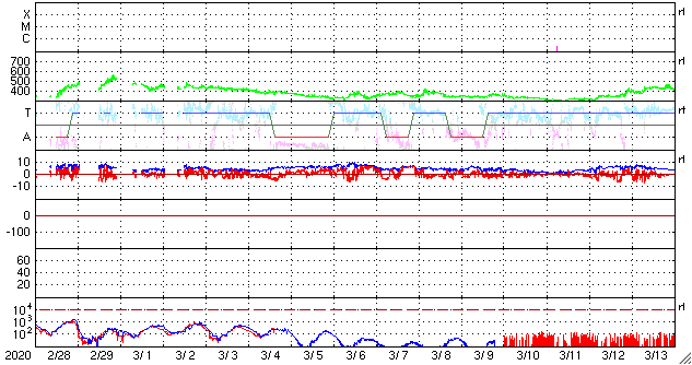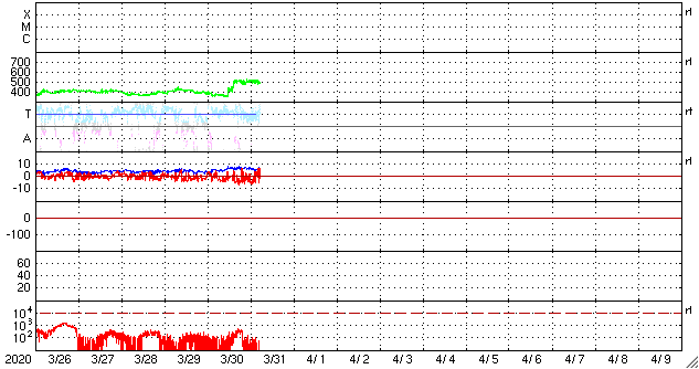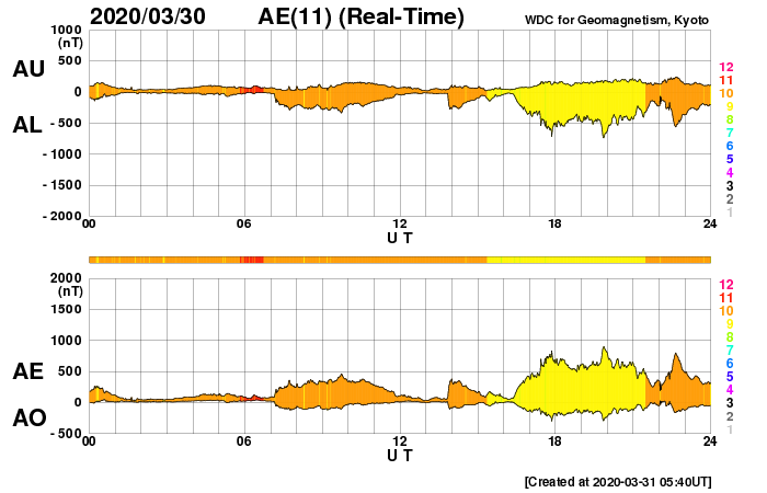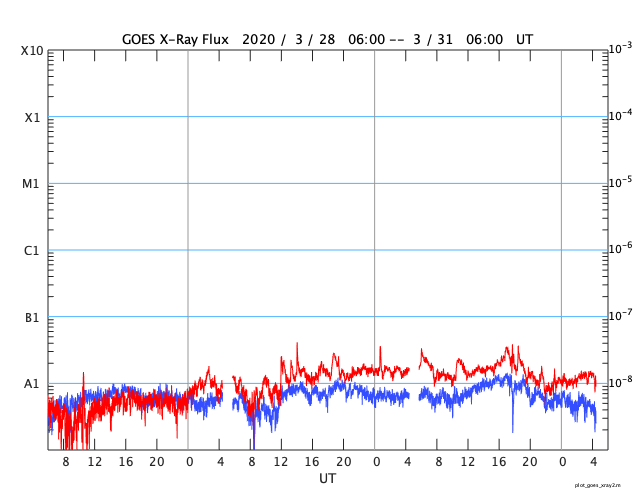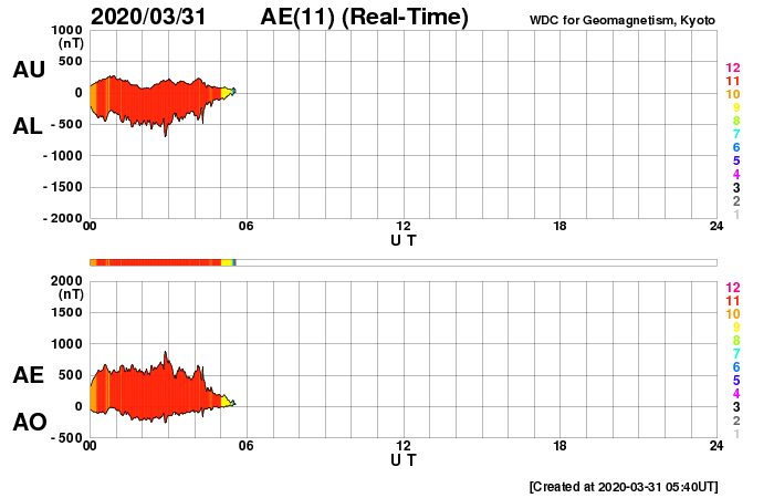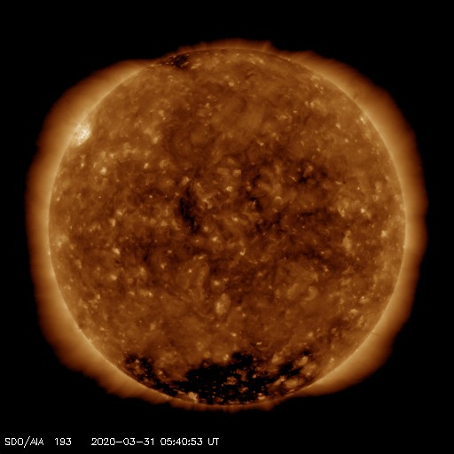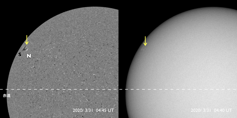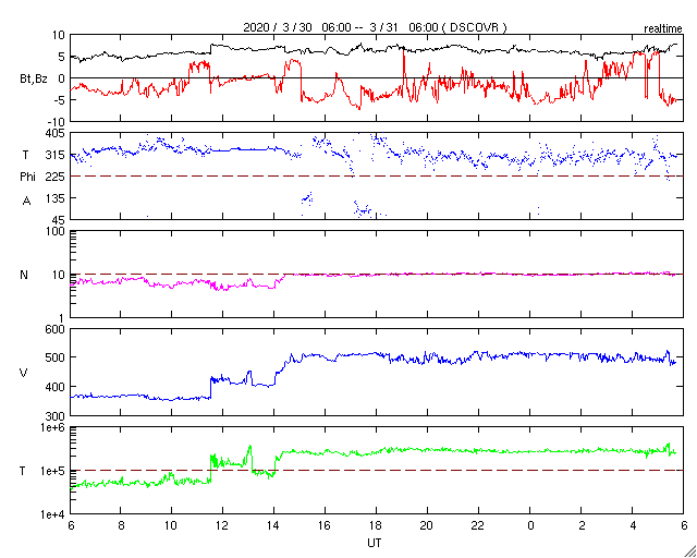 2020/ 3/31 14:51 更新 太陽の黒点は少し見やすくなっています。太陽風が高速になり、磁気圏の活動も高まっています。 担当 篠原 太陽の北東(左上)に現れた黒点は、 昨日よりも少し見やすくなっています。 SDO衛星による磁場と可視光の写真を掲載します。 磁場の並びは、左にS極、右にN極で、 新しい第25活動周期の北半球の順番です。 位置は、北緯28度くらいです。 今朝のNOAAの報告書では、 群の番号はまだ付けられていませんでした。 X線グラフでは、Aクラスの小さい変化が起きています。 一方、全体の強度はグラフの最後で少し下がっていて、 この後、弱まっていくのかもしれません。 太陽風は、昨夜から速度が高まり始め、 今日に入る頃に、500km/秒の高速風に達しています。 磁場強度は、5nTから6nTに少し上がっていますが、 平均的な状態です。 太陽の南半球に見えていたコロナホールの影響が やって来たのかもしれません。 磁場の南北成分は、-3〜 -5nTの南向きの変化が続いています。 磁気圏の活動も高まって、 AE指数は、800nTに達する中規模の活動が続いています。 SDO衛星で見えていたコロナホールは、縦に細長く伸びていて、 横の広がりはありませんでした。 太陽風速度の高まりは、短い期間で終わるかもしれません。