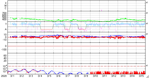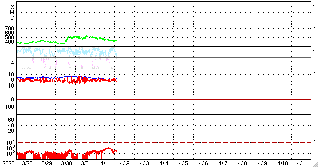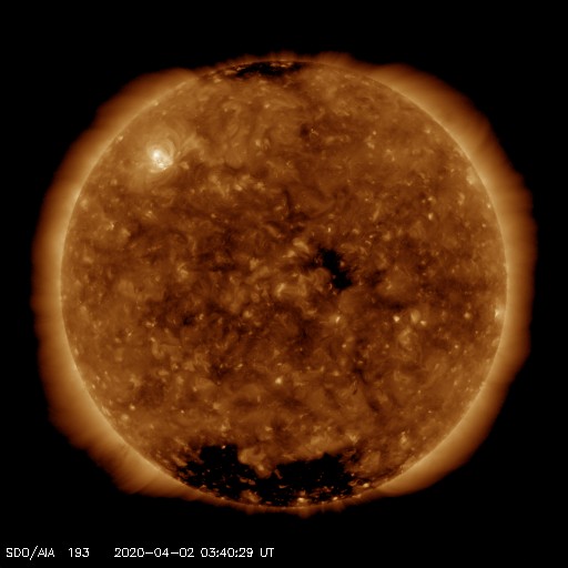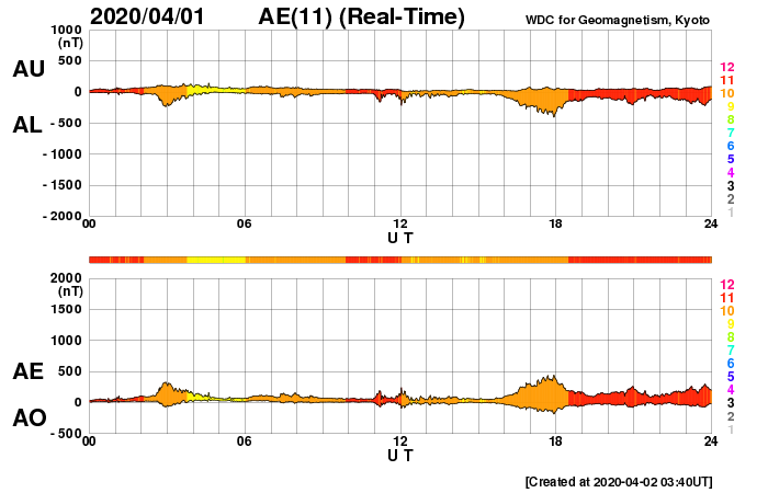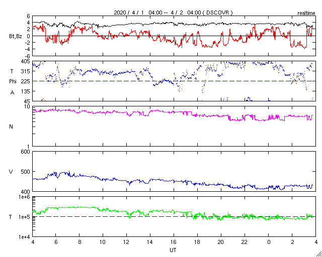 2020/ 4/ 2 12:52 更新 太陽風は平均的な速度に戻っています。2759黒点群は少し大きくなっています。 担当 篠原 太陽風の速度は、昨日のニュースの後に再び500km/秒へ高まりましたが、 その後は低下が続いて、420km/秒と平均的な速さに戻っています。 磁場強度は、3〜4nTとやや弱い状態です。 磁場の南北成分は、 南寄りに変化していますが、振れ幅は小さく、 AE指数は小規模の変化が起きている程度です。 太陽風の速度が下がってきたので、 磁気圏は穏やかになっていくでしょう。 SDO衛星AIA193は、 太陽の中心部に小さいコロナホールが見える程度です。 27日周期の図の前周期と同様に、 しばらく穏やかな太陽風が続きそうです。 太陽の2759黒点群は、昨日より少し大きくなっています。 X線グラフでは、Aクラスの小さいフレアも起きています。
