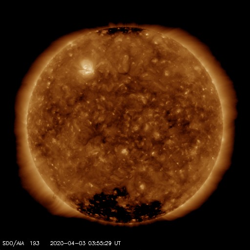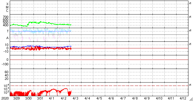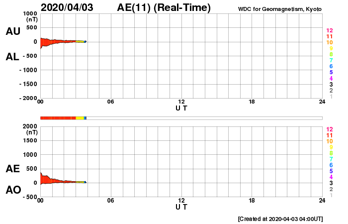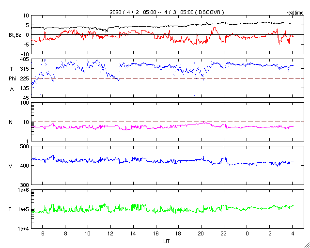 2020/ 4/ 3 13:11 更新 太陽風は平均的な状態です。 担当 篠原 太陽風は、420km/秒前後と平均的な速さで安定しています。 磁場強度は、3nTから6nTへやや上がっていますが、 こちらも平均的な状態です。 磁場の南北成分は、 -3nT程度の南向きの変化が度々見られています。 磁気圏はやや活動的な状態が続いていて、 AE指数は300〜600nT程度の小中規模の変化が 繰り返し発生しています。 SDO衛星AIA193では、太陽の低緯度域にコロナホールはなく、 太陽風は、基本的には穏やかな状態が続きそうです。 太陽の2759黒点群は、昨日とほとんど同じ大きさです。 X線グラフは、Aクラスの小さい変化も見られなくなっていて、 穏やかです。 ![]() SDO衛星のAIA193カメラによる太陽コロナの様子 (c) SDO (NASA) ![]() SDO衛星による太陽の可視光写真。マウスの矢印を写真に重ねると、黒点番号付きの写真に切り替わります。 (c) SDO (NASA) ![]() DSCOVRが観測した太陽風の磁場(1番上の枠、黒線は全体の強度、赤線は南北成分) および、太陽風の密度(3番目の紫線)、速度(4番目の青線) (c) データ:NOAA/SWPC、作図:宇宙天気ニュース ![]() AE指数(速報値) 下段のAEグラフの値が高くなると、オーロラ活動が活発化しています。 (c) 京都大学WDC ![]() ![]() 27日の太陽周期に合わせたデータプロット 太陽が同じ面を地球に向けていた27日前の変化から、今後を予想することができます。 (c) 作図:宇宙天気ニュース