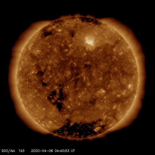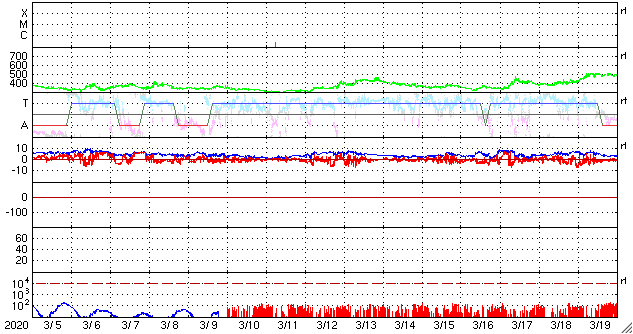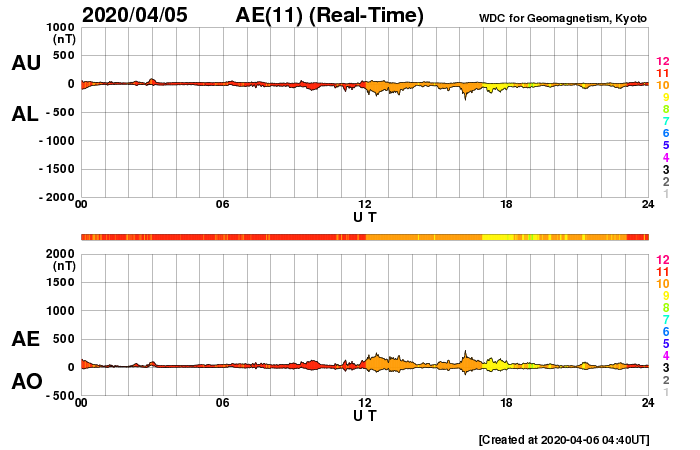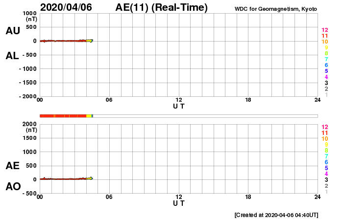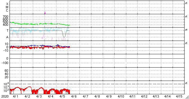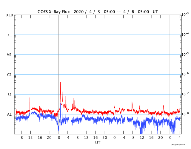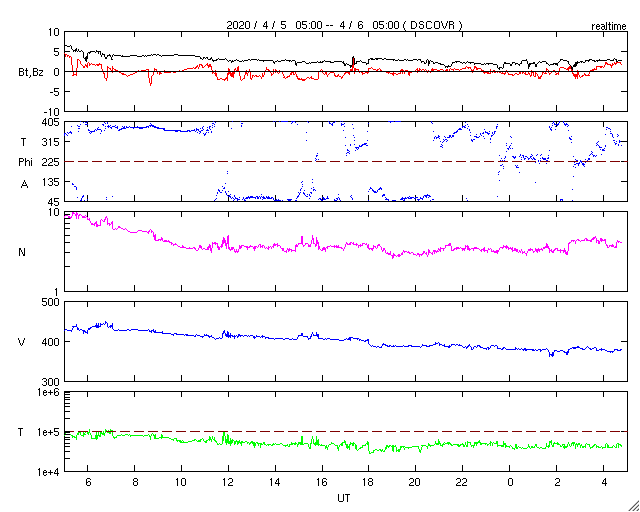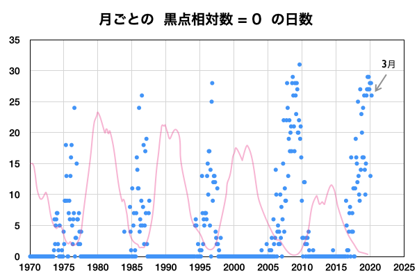 2020/ 4/ 6 13:52 更新 3月の黒点数は 1.5 でした。太陽風はやや低速になり、磁気圏も穏やかです。 担当 篠原 WDC-SILSOより、 3月の黒点相対数の月平均値は、 1.5 と発表されました。 3月の太陽は、8〜9日頃に2758群が南半球に現れ、 30〜31日頃に2759群が北半球に現れています。 また、群番号は付きませんでしたが、 18日にも小さい黒点が北半球に現れています(3月19日の記事参照)。 1か月間ほとんど無黒点だった2月に比べると、 黒点の出現は増えていますが、 まだまだ活動の低い状態が続いています。 無黒点の日数も、26日と多い状態です。 昨年の6月以降は、今年の1月に無黒点日の少ない月があったものの、 それ以外はずっと26日以上を記録しています。 第25活動周期の特徴を持つ黒点は現れていますが、 新しい活動周期の本格的な立ち上がりは、まだ迎えていません。 今日の太陽も無黒点です。 X線グラフも変化はなく、穏やかです。 太陽風は、速度が380km/秒へ下がり、やや低速になっています。 磁場強度も、2〜3nTと弱くなっています。 磁場の南北成分は、0nT付近でほとんど変化しなくなっています。 磁気圏も静かになっていて、 AE指数は小さい変化が見られる程度です。